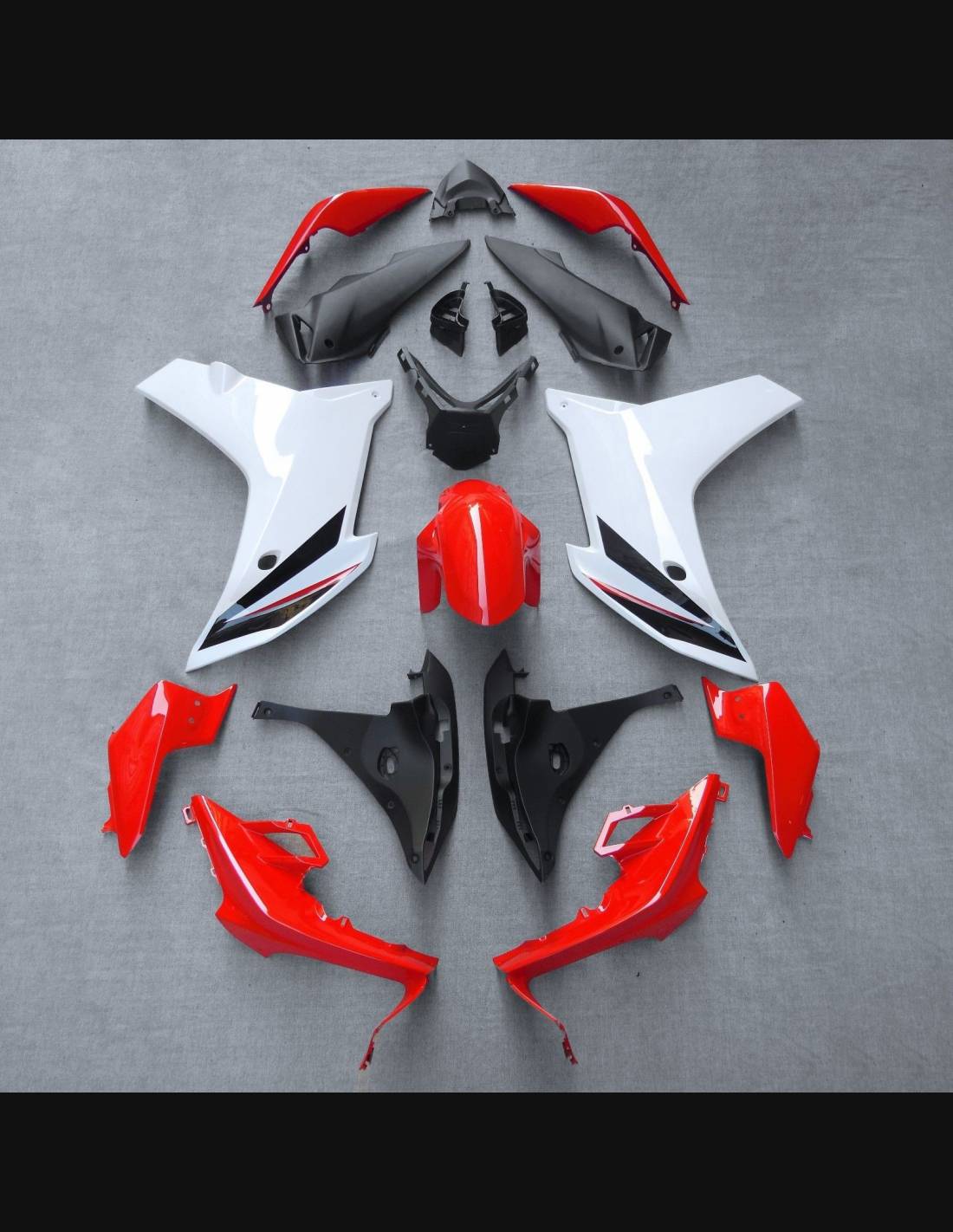 Les carénages sont fait en ABS (plastique) et sont compatible avec les carénages d’origine de la moto. Sont fournis déjà avec tous les trous et les supports internement, pour garantir un montage facile et sans modification, sur la moto de client. Aussi les carénages sont compatible avec les vis et tous les autre accessoires d’origine de la moto. Dans le prix est inclus aussi la protection chaleur pour le bas de carénage.