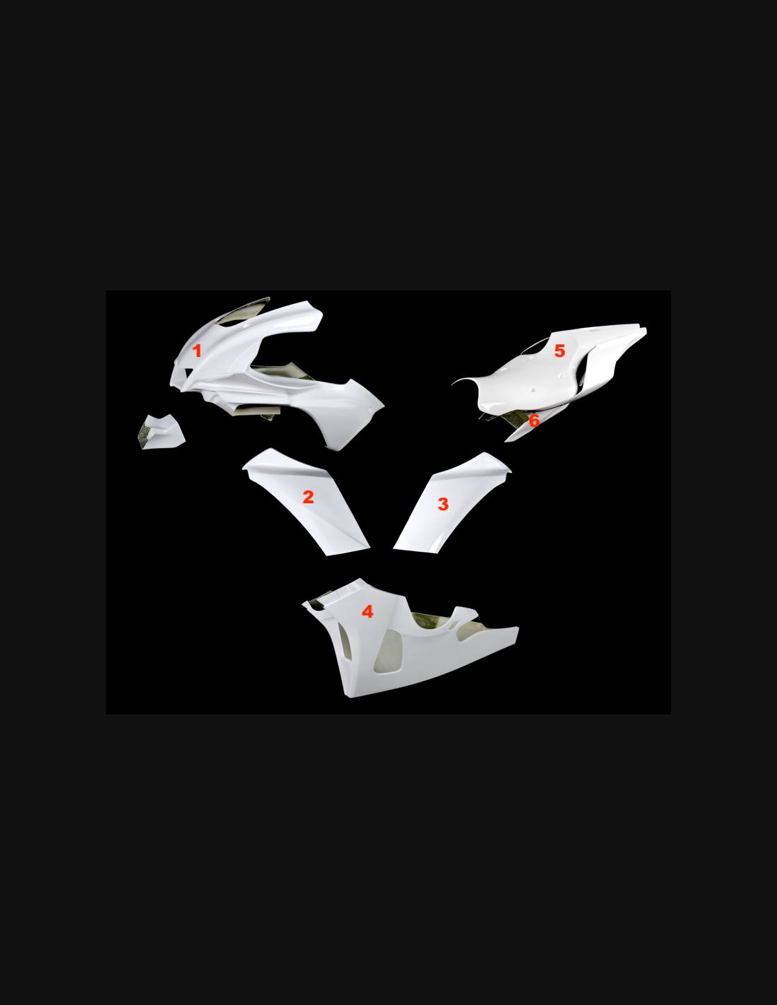 Le kit carénages comprend: tête de fourche, flanc gauche et droit, bas de carénage, coque arrière complet (le cache réservoir n’est pas inclus).