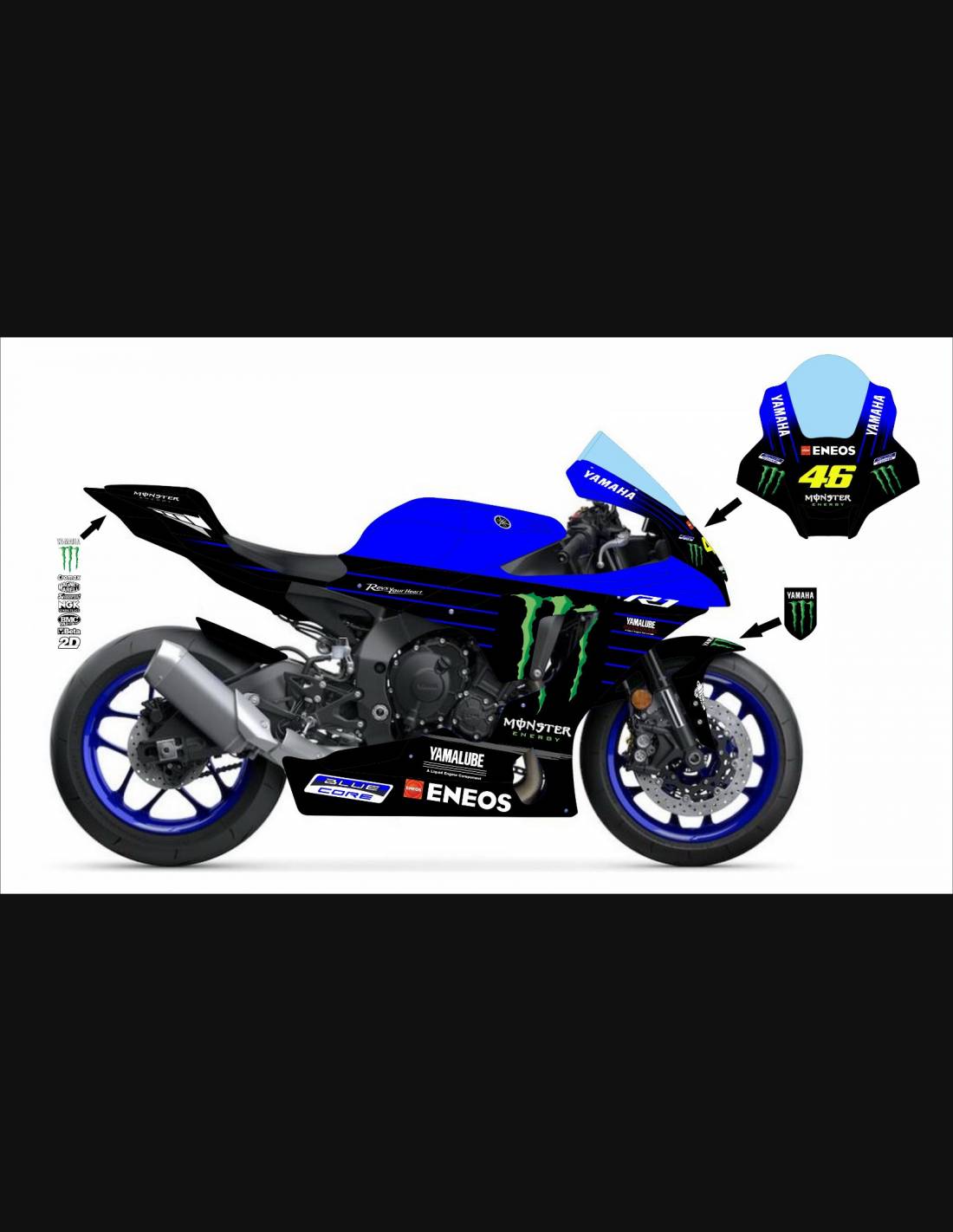 Elite : nous utilisons des peintures de haute qualité avec des nuances similaires à l'original. Les stickers sont imprimés à l'aide d'imprimantes 8 couleurs qui leur confèrent une brillance et des nuances impeccables. L’ensemble du graphisme est recouvert de trois couches de transparent pour conserver les couleurs de le carénage vives au fil du temps. Nous peignons également tout le kit de carénage à l'intérieur.