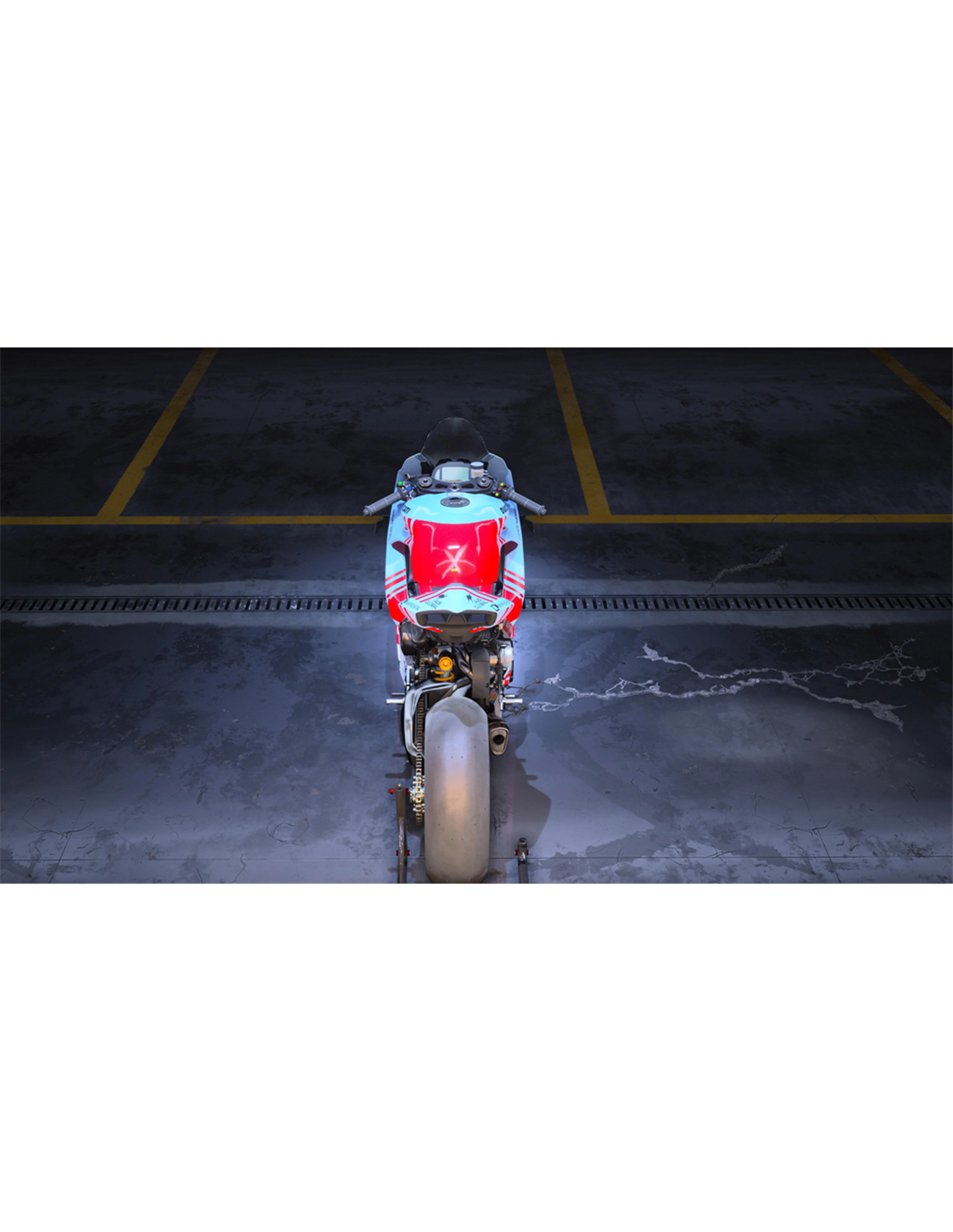 Elite: nous utilisons des couleurs compatibles avec le réservoir d'origine de la moto (par exemple le rouge Ducati). Les stickers sont imprimés à l'aide d'imprimantes 8 couleurs qui leur confèrent une brillance et des nuances impeccables. L’ensemble du graphisme est recouvert de trois couches de transparent pour conserver les couleurs de le carénage vives au fil du temps. Nous peignons également tout le kit de carénage à l'intérieur.