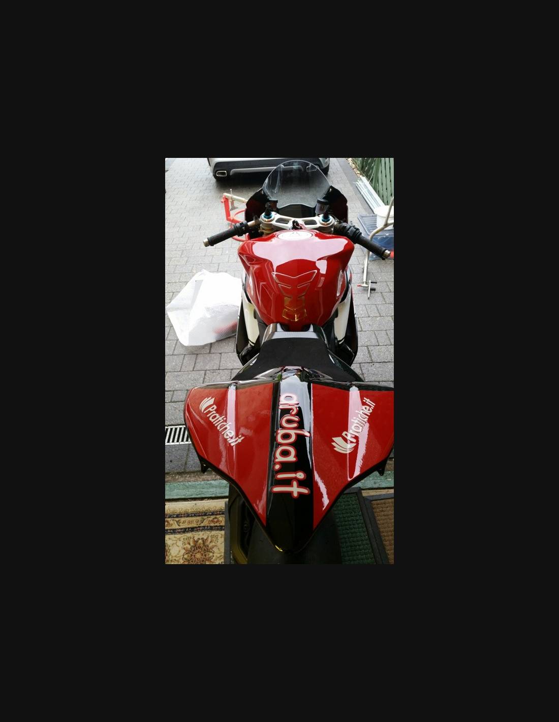 Elite: nous utilisons des couleurs compatibles avec le réservoir d'origine de la moto (par exemple le rouge Ducati). Les stickers sont imprimés à l'aide d'imprimantes 8 couleurs qui leur confèrent une brillance et des nuances impeccables. L’ensemble du graphisme est recouvert de trois couches de transparent pour conserver les couleurs de le carénage vives au fil du temps. Nous peignons également tout le kit de carénage à l'intérieur.