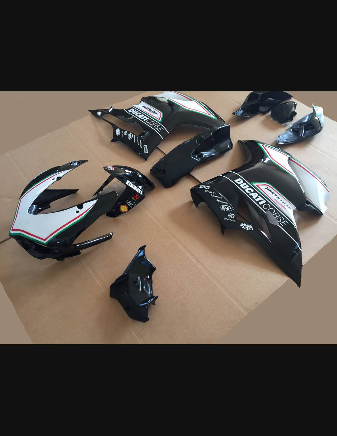 Elite: nous utilisons des couleurs compatibles avec le réservoir d'origine de la moto (par exemple le rouge Ducati). Les stickers sont imprimés à l'aide d'imprimantes 8 couleurs qui leur confèrent une brillance et des nuances impeccables. L’ensemble du graphisme est recouvert de trois couches de transparent pour conserver les couleurs de le carénage vives au fil du temps. Nous peignons également tout le kit de carénage à l'intérieur.