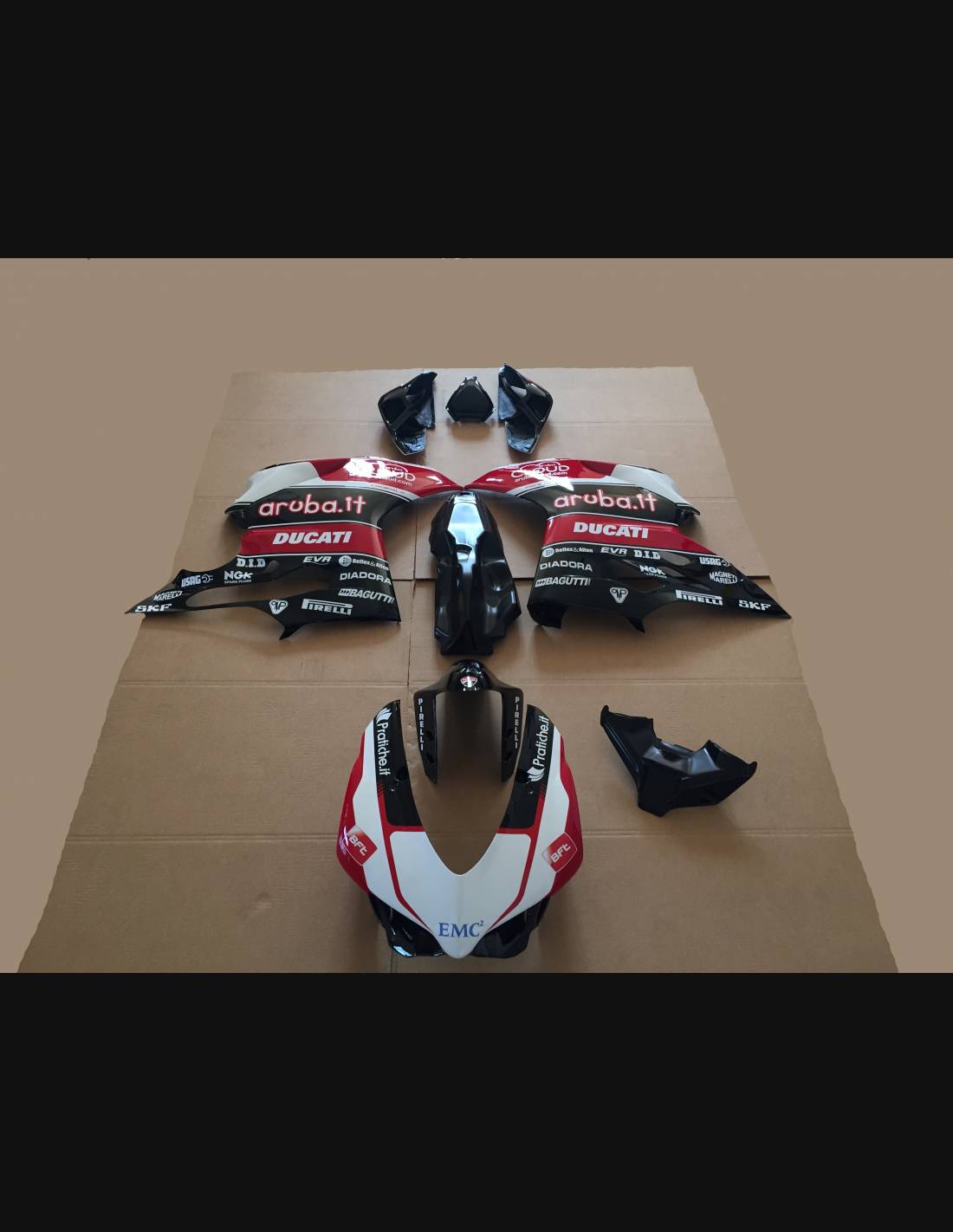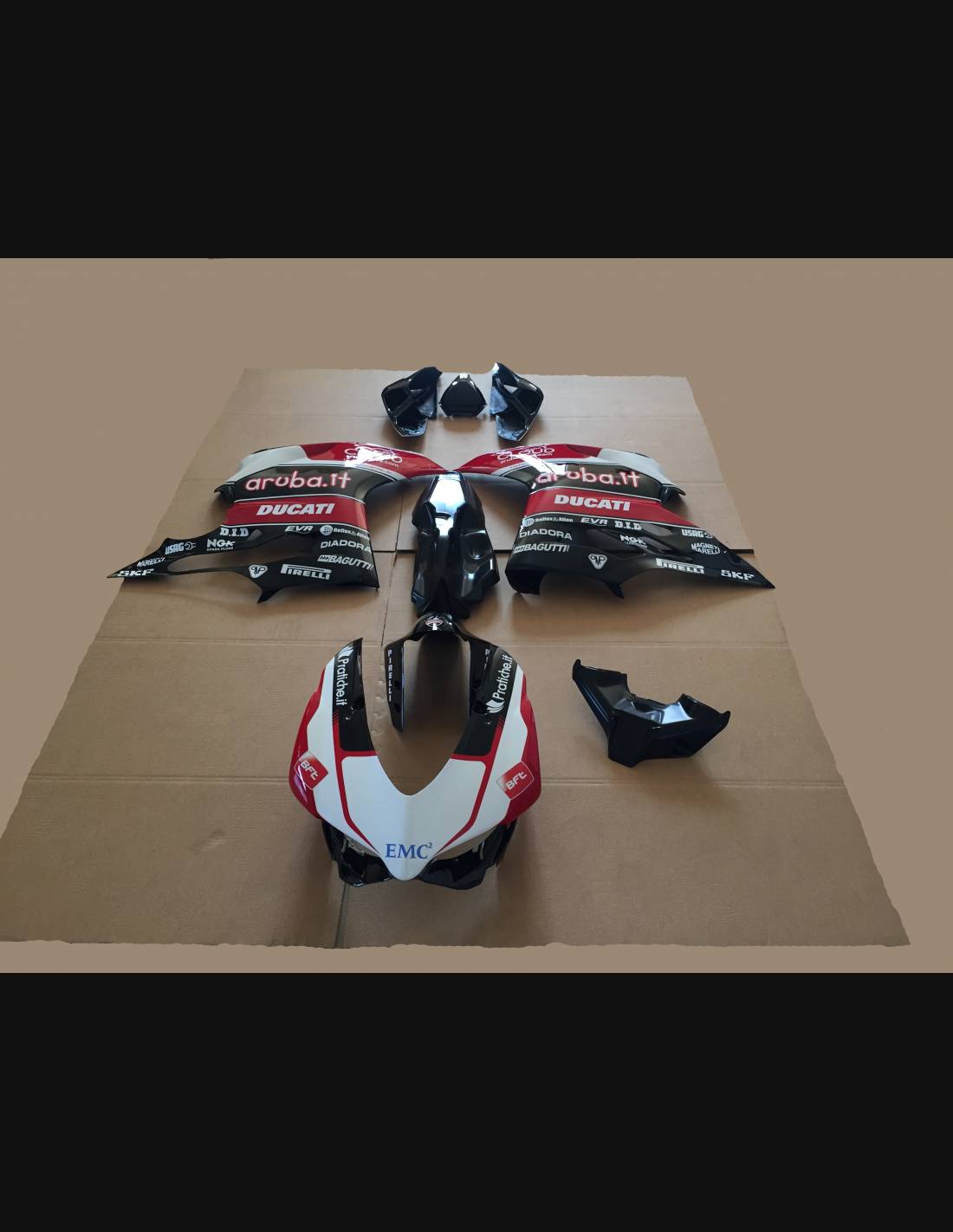 Elite: nous utilisons des couleurs compatibles avec le réservoir d'origine de la moto (par exemple le rouge Ducati). Les stickers sont imprimés à l'aide d'imprimantes 8 couleurs qui leur confèrent une brillance et des nuances impeccables. L’ensemble du graphisme est recouvert de trois couches de transparent pour conserver les couleurs de le carénage vives au fil du temps. Nous peignons également tout le kit de carénage à l'intérieur.