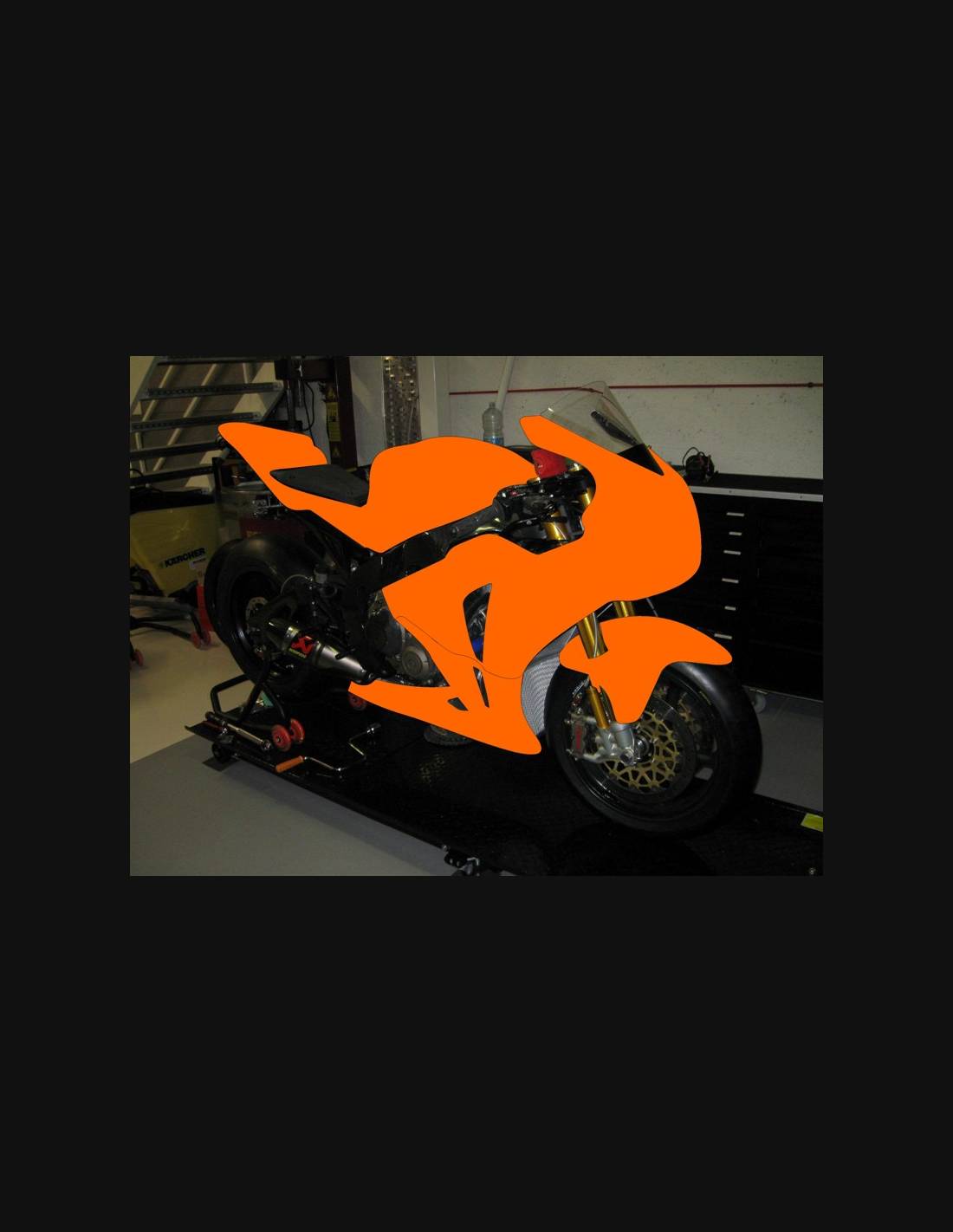 Le kit carénages comprend: tête de fourche, flanc gauche et droit, bas de carénage fermé et homologué pour la piste, coque arrière complet (le cache réservoir n’est pas inclus).