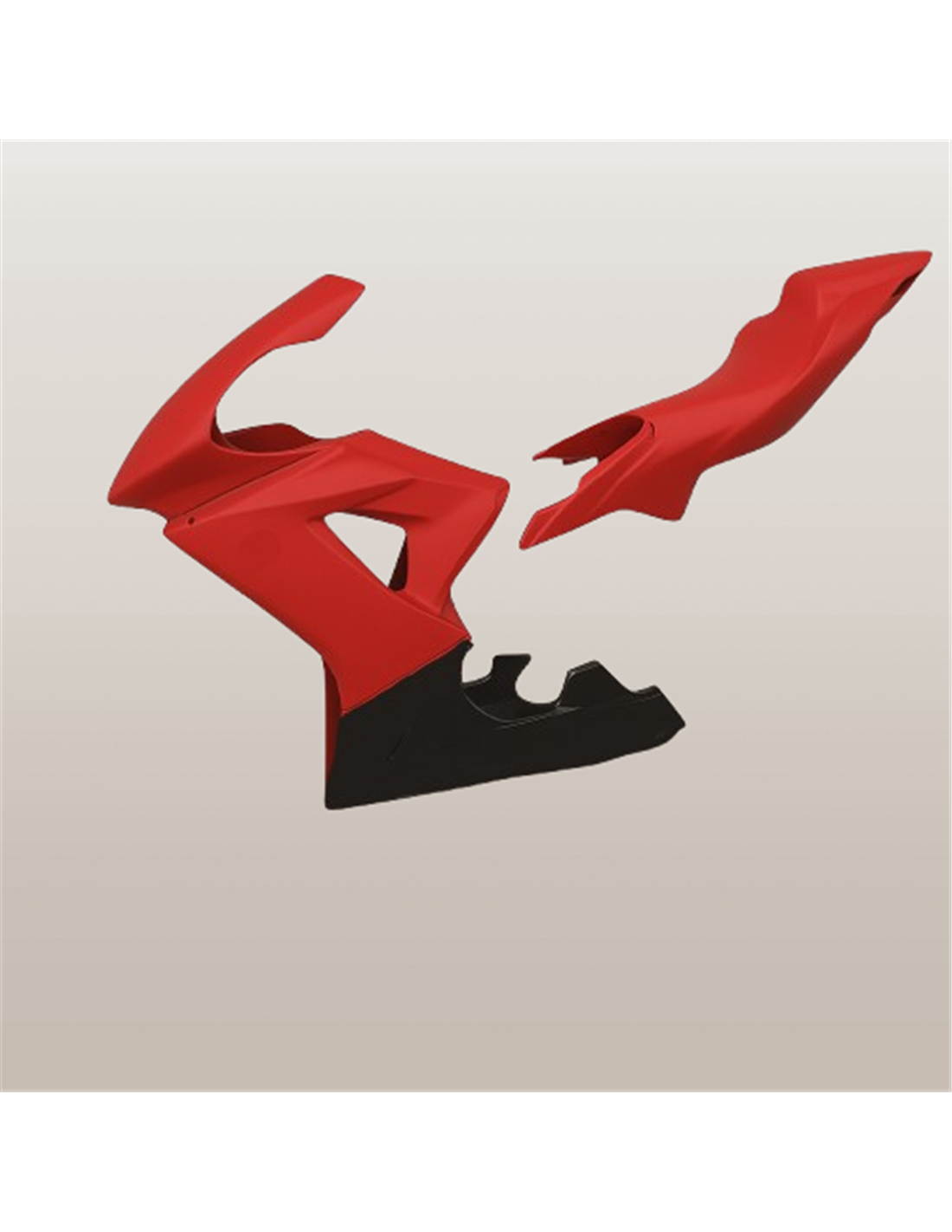 Le kit carénages comprend: tête de fourche, flanc gauche et droit, bas de carénage fermé et homologué pour la piste, coque arrière complet (le cache réservoir n’est pas inclus).