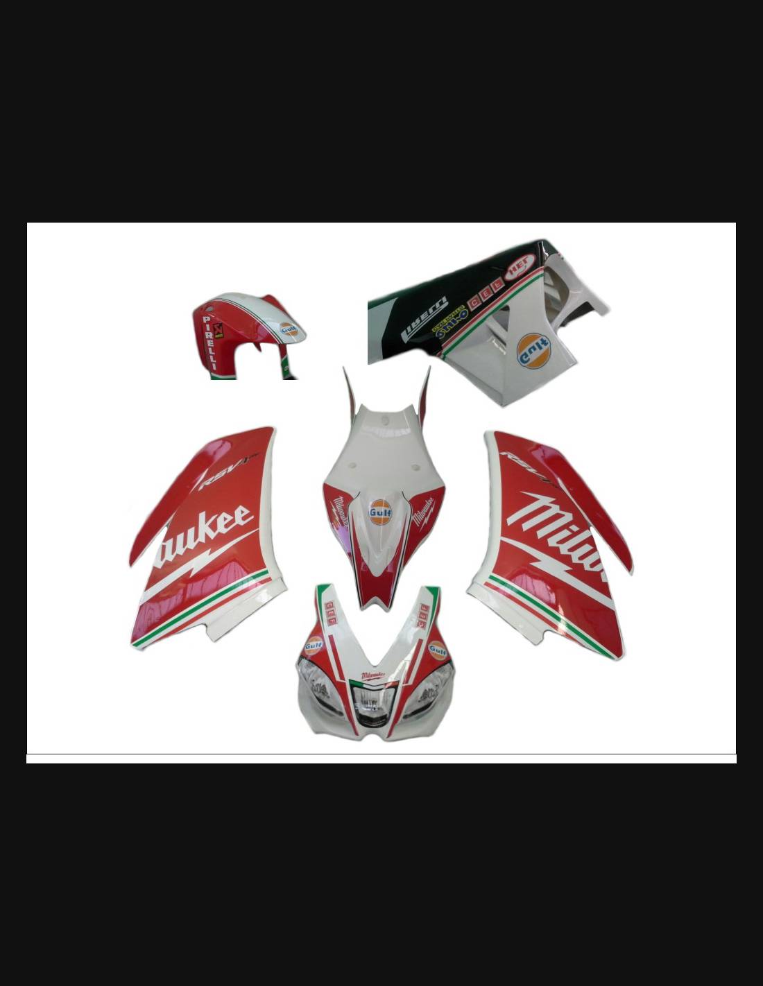 Le kit carénages comprend: tête de fourche, flanc gauche et droit, bas de carénage fermé et homologué pour la piste, coque arrière complet et garde boue avant (le cache réservoir n’est pas inclus).