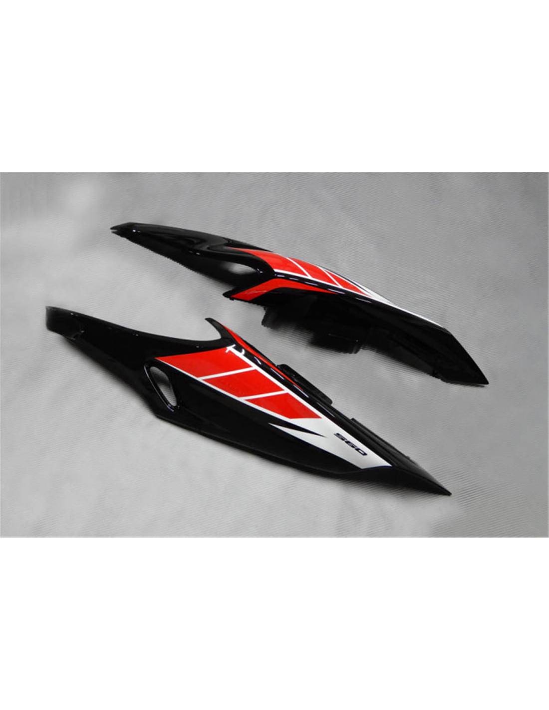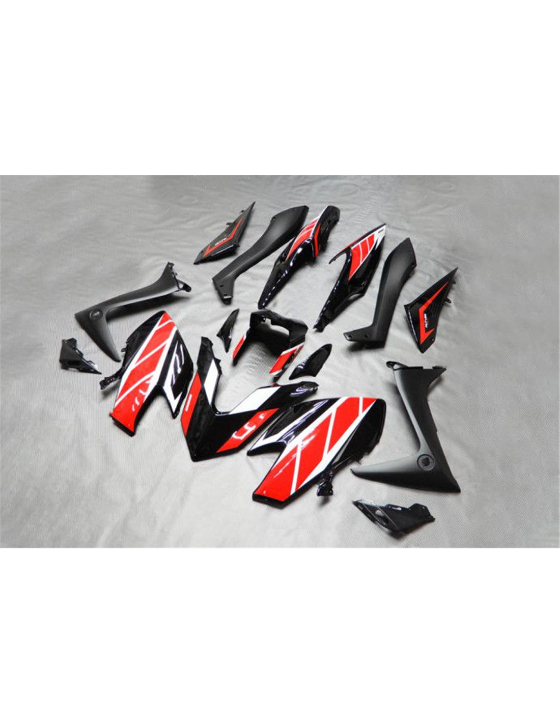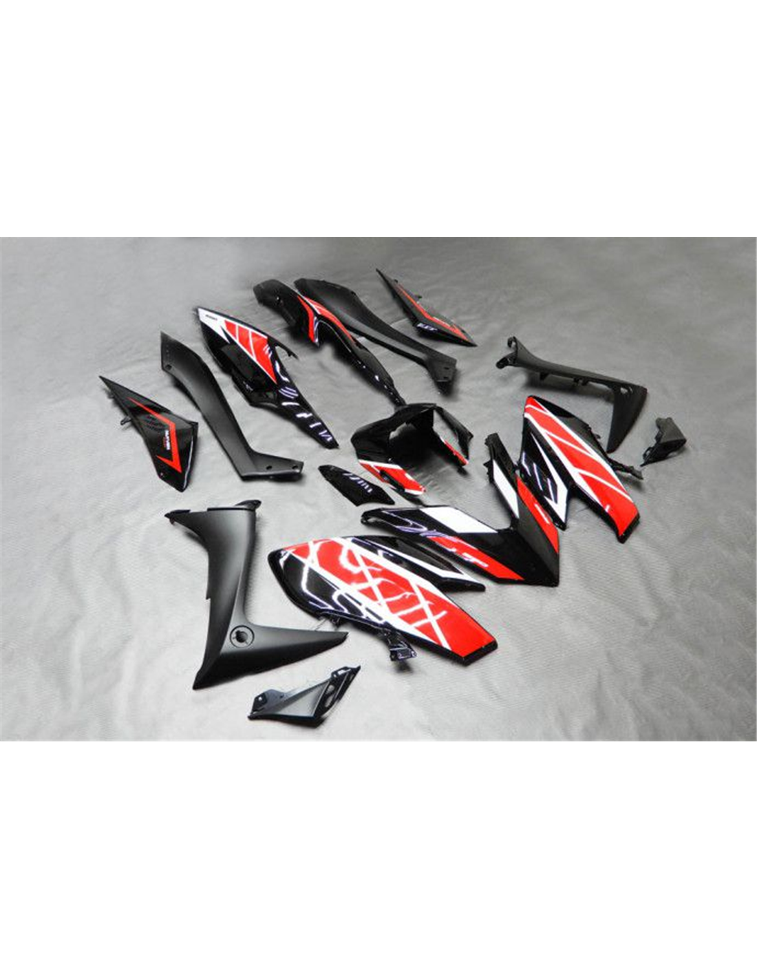 The fairing kit includes: front upper part, side fairings right and left, lower fairing right and left, back seat, front fender and all eventual internal black plastics.