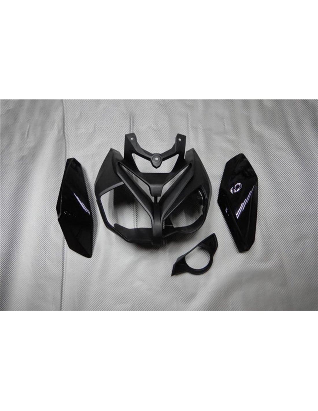 The fairing kit includes: front upper part, side fairings right and left, lower fairing right and left, back seat, front fender and all eventual internal black plastics.