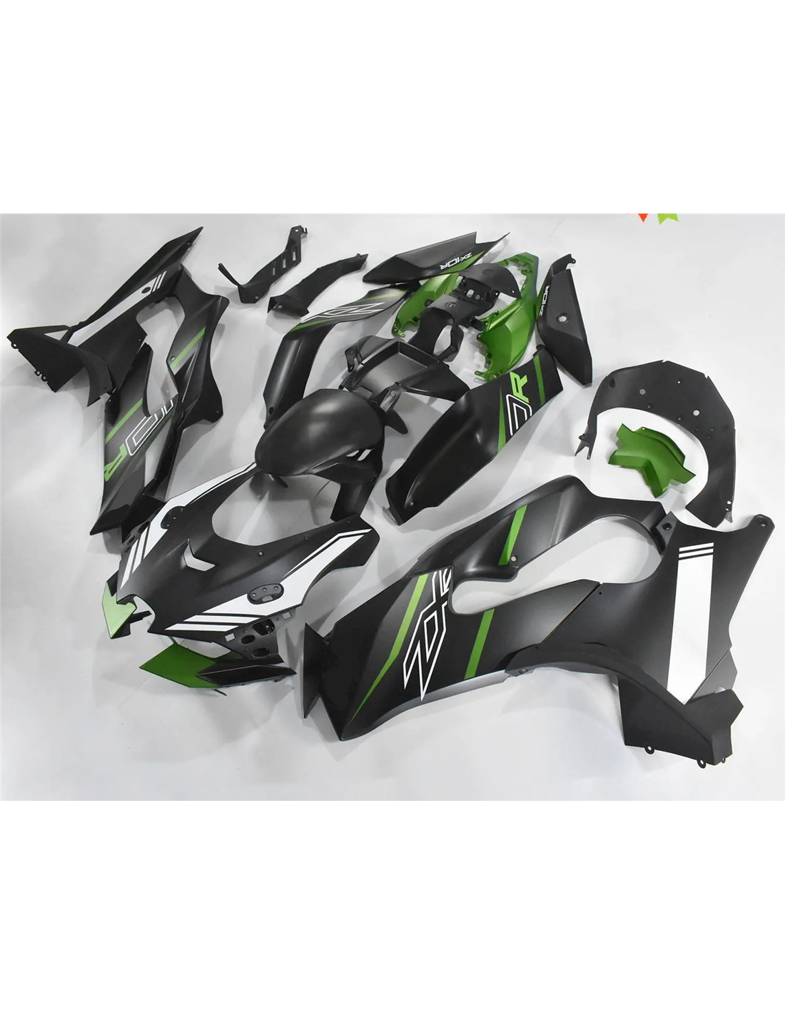 The fairing kit includes: front upper part, side fairings right and left, lower fairing right and left, back seat, front fender and all eventual internal black plastics.