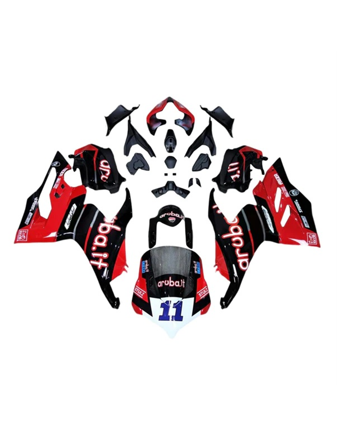 The fairing kit includes: front upper part, side fairings right and left, lower fairing right and left, back seat, front fender and all eventual internal black plastics.