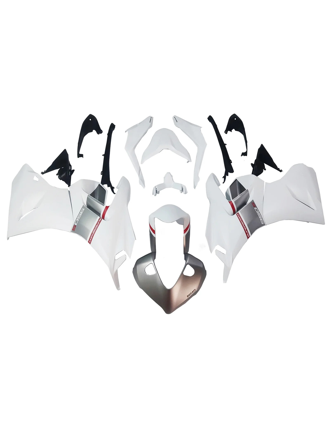 The fairing kit includes: front upper part, side fairings right and left, lower fairing right and left, back seat, front fender and all eventual internal black plastics.