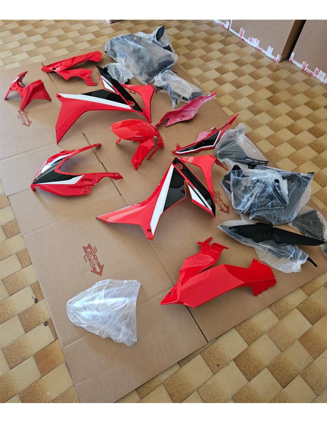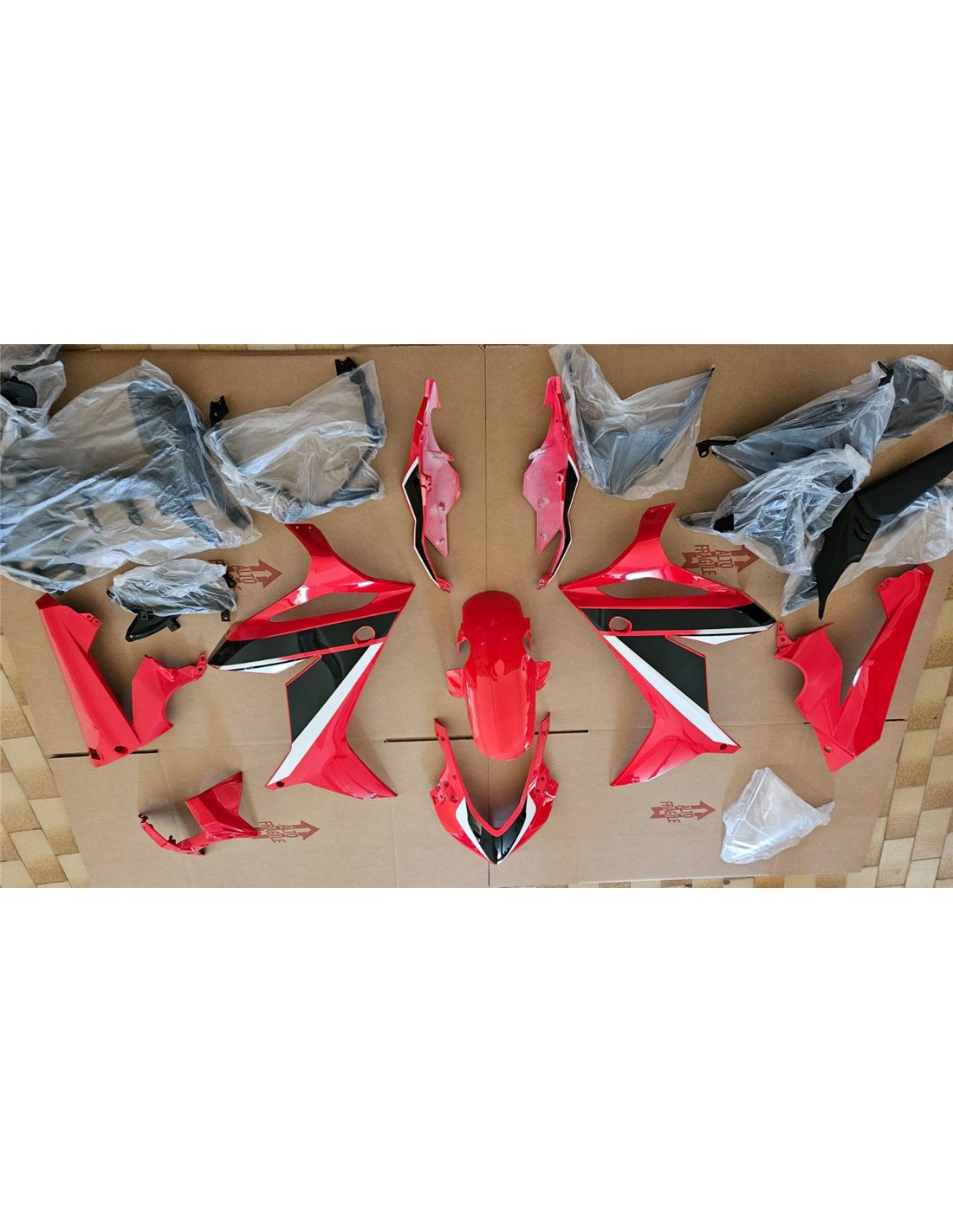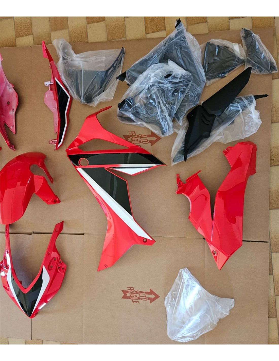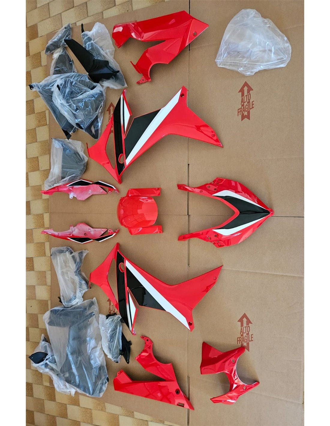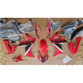 The fairing kit includes: front upper part, side fairings right and left, lower fairing right and left, back seat, front fender and all eventual internal black plastics.