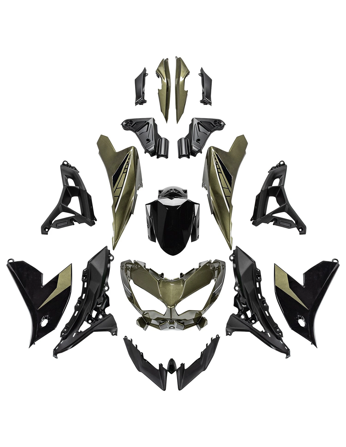 The fairing kit includes: front upper part, side fairings right and left, lower fairing right and left, back seat, front fender and all eventual internal black plastics.