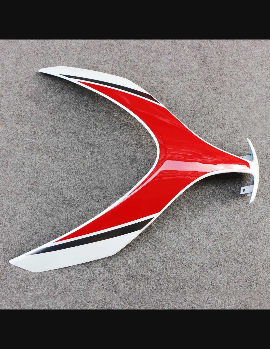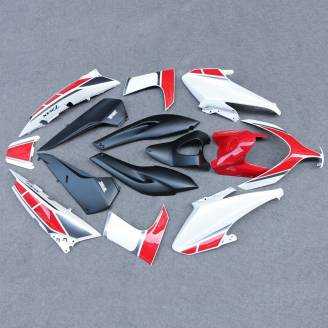 The fairing kit includes: front upper part, side fairings right and left, lower fairing right and left, back seat, front fender and all eventual internal black plastics.