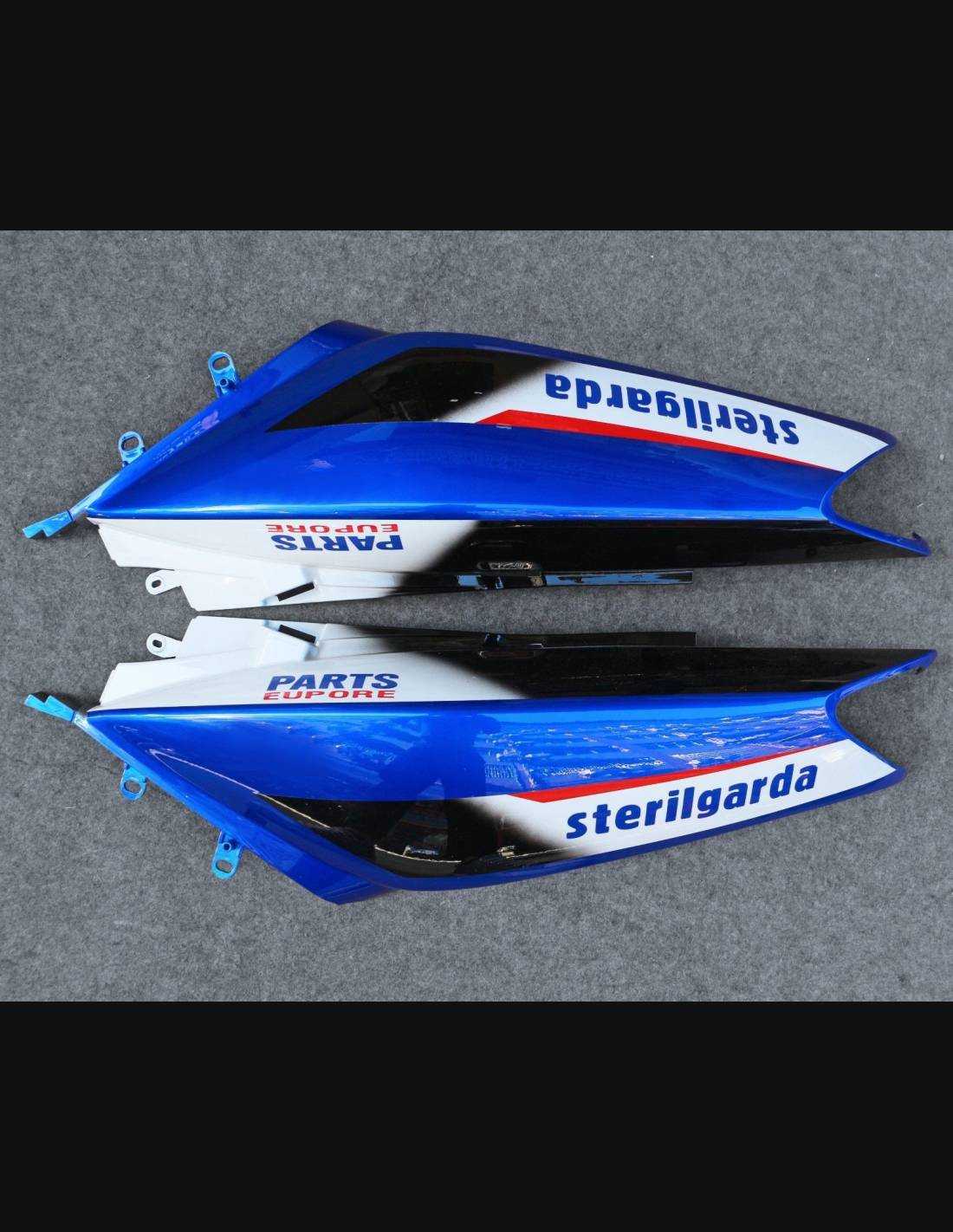 The fairing kit includes: front upper part, side fairings right and left, lower fairing right and left, back seat, front fender and all eventual internal black plastics.