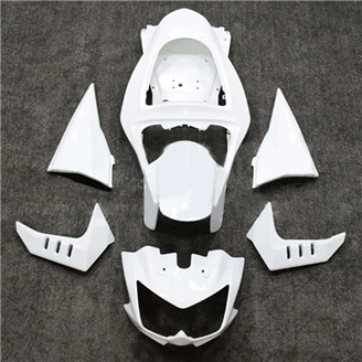 The fairing kit includes: front upper part, side fairings right and left, lower fairing right and left, back seat, front fender and all eventual internal black plastics.