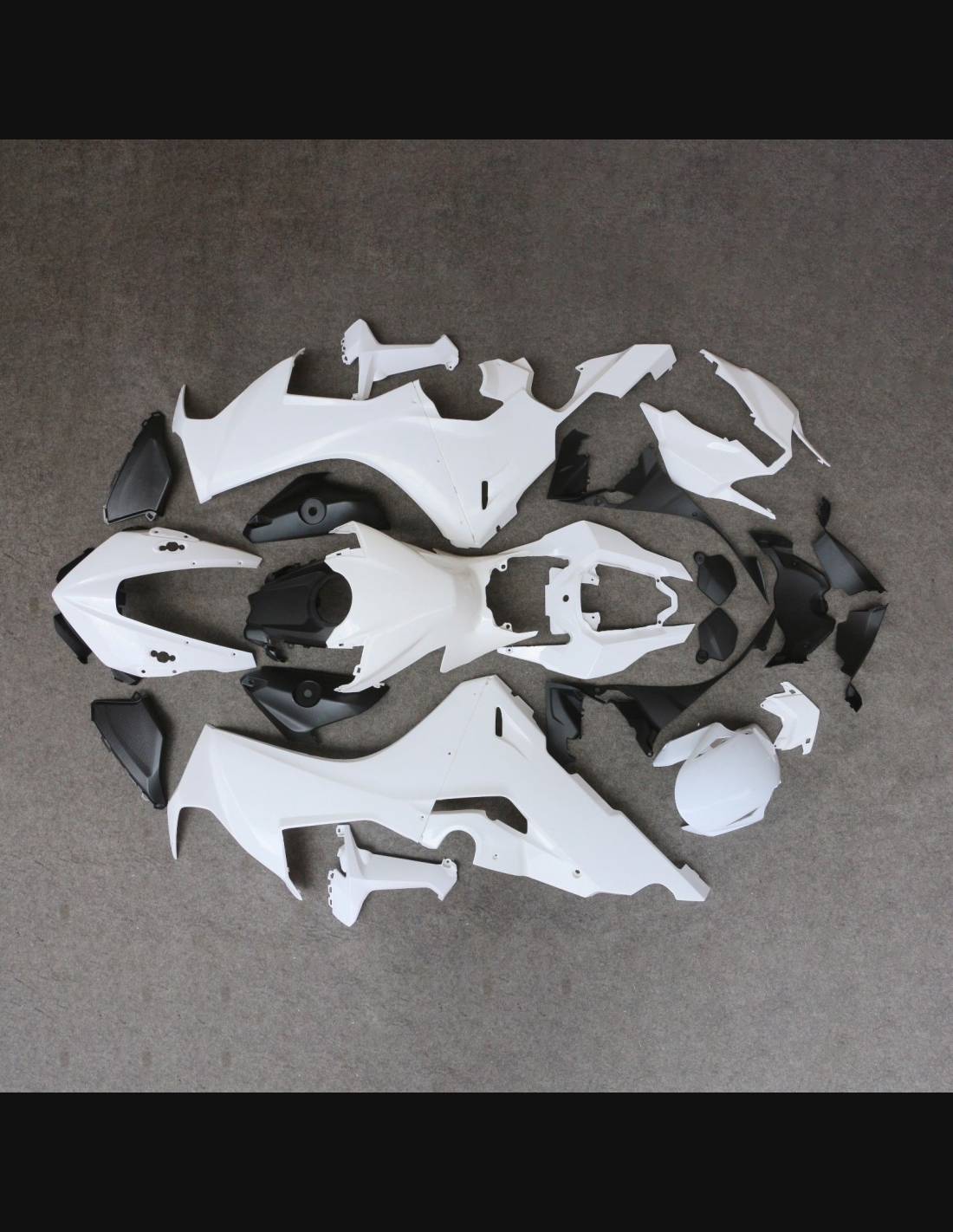 The fairing kit includes: front upper part, side fairings right and left, lower fairing right and left, back seat, front fender, tank cover and all eventual internal black plastics.