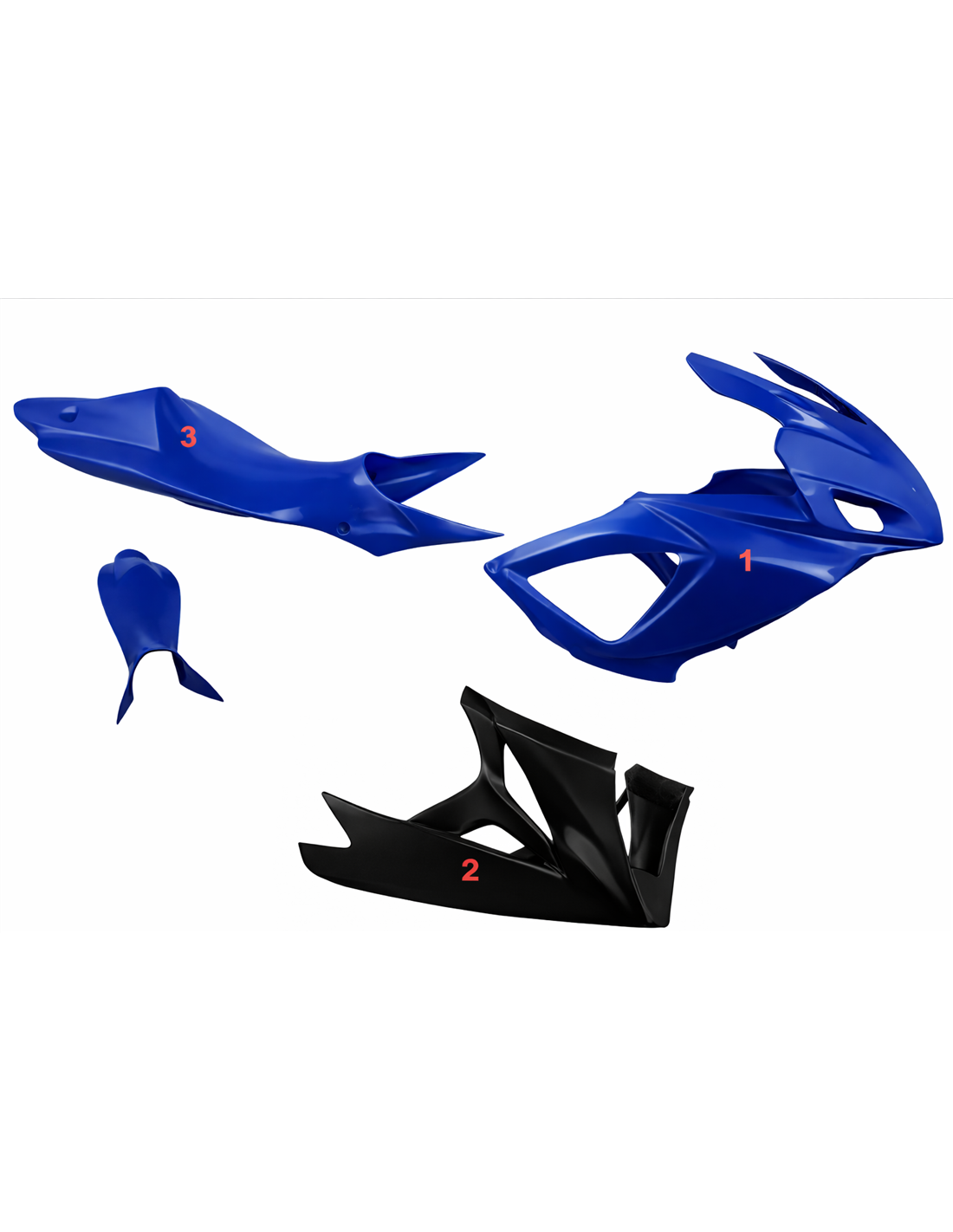 The fairing kit includes: front upper part, side fairings right and left, lower fairing, back seat (the tank cover is not included in the price).