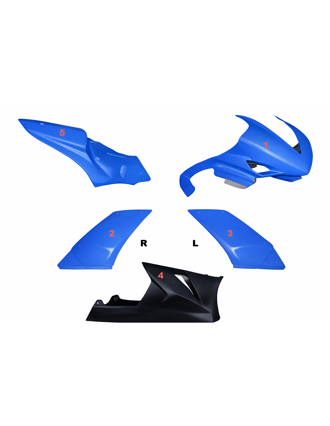 The fairing kit includes: front upper part, side fairings right and left, lower fairing, back seat (the tank cover is not included in the price).