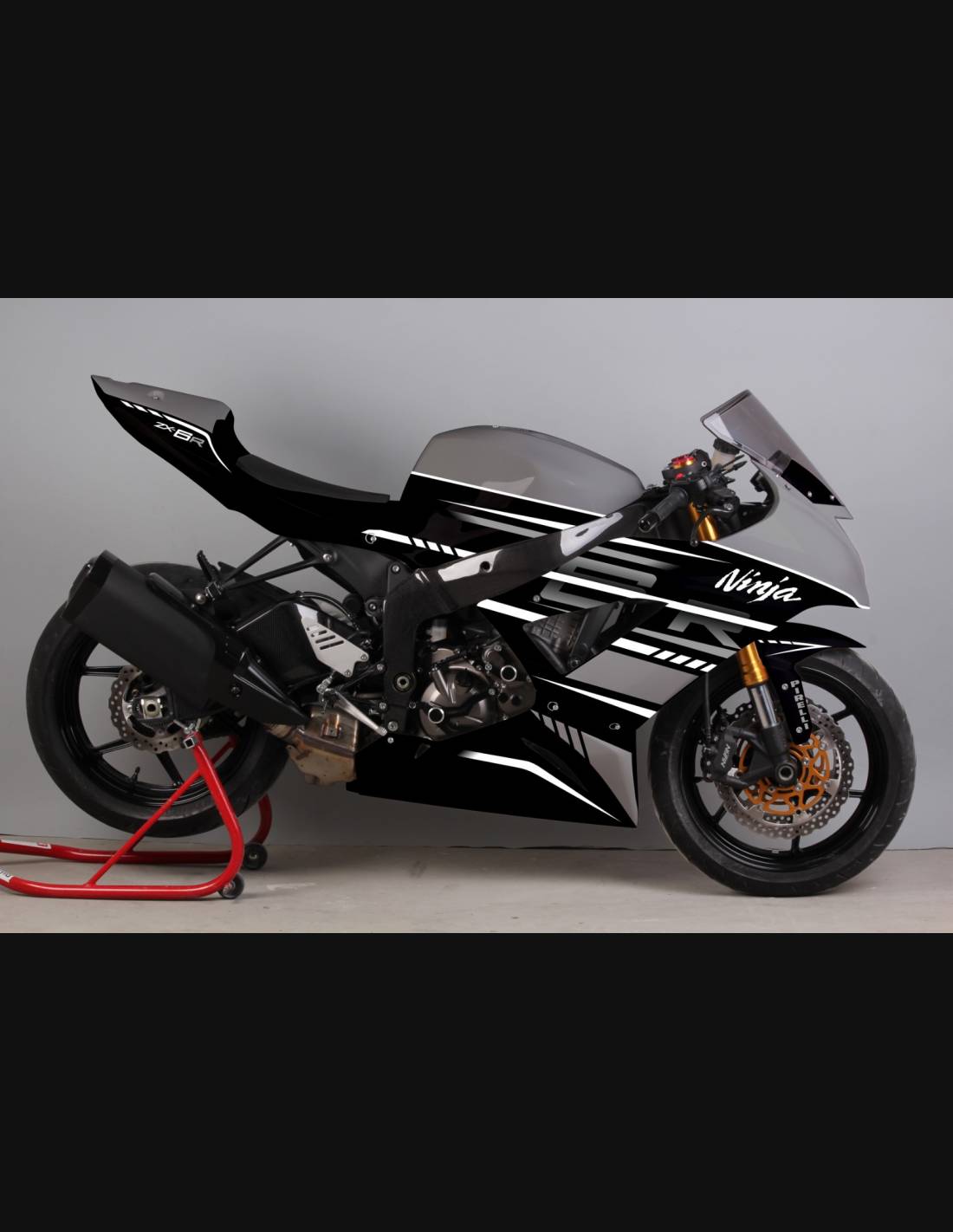 Elite: we use compatible colours with the stock tank of the motorcycle (e.g. Kawasaki’s green). The stickers are printed using 8-color printers which give them impeccable shine and shades. The whole graphic is under three layers of clear coat to keep the colors of the bodywork bright over time. We also paint the whole fairing kit inside.