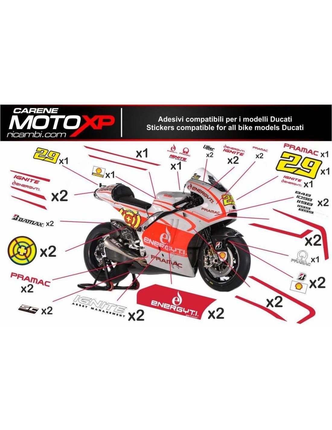 Stickers are produced with high quality materials and are adapted on the dimensions of the bike that the customer indicates during the purchase. The kit includes all non-original stickers, in order to complete the desired design: for front upper part, right and left side fairing, belly pan, back seat, swingarm and front fender. It’s possible to customize stickers too (colours, numbers, names, etc). It’s important to write changes in the field “more information”. The price of the sticker kit doesn’t change, unless substantial modifications (e.g. fluorescent colours). Through the purchase, you accept the sales conditions. You can stick them under the clear coat or after it. Unless a different request of the customer, we will supply the sticker kit with the protection.