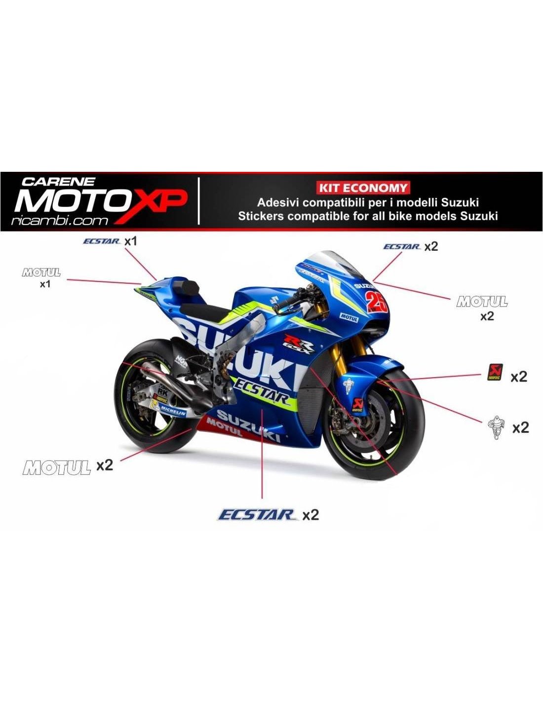 Gli adesivi sono realizzati con materiali di prima qualità e vengono dimensionati per il tipo di moto indicata al momento dell’acquisto. Il kit è composto di tutti gli adesivi non originali, per completare la grafica scelta: per cupolino, carena destra e sinistra, serbatoio, puntale destro sinistro, codino, forcellone e parafango anteriore. Gli adesivi si possono anche personalizzare (colore, numeri nomi o altro) scrivete tutto prima di aggiungere al carrello nello spazio “ulteriori informazioni”. Il costo del kit adesivi non varia, eccetto sostanziali modifiche ad esso (es. colori fluorescenti). Con l’acquisto, si accettano le condizioni di vendita.Si possono attaccare sia sopra che sotto trasparente. Salvo diversa richiesta del cliente, il kit viene fornito con la protezione applicata.