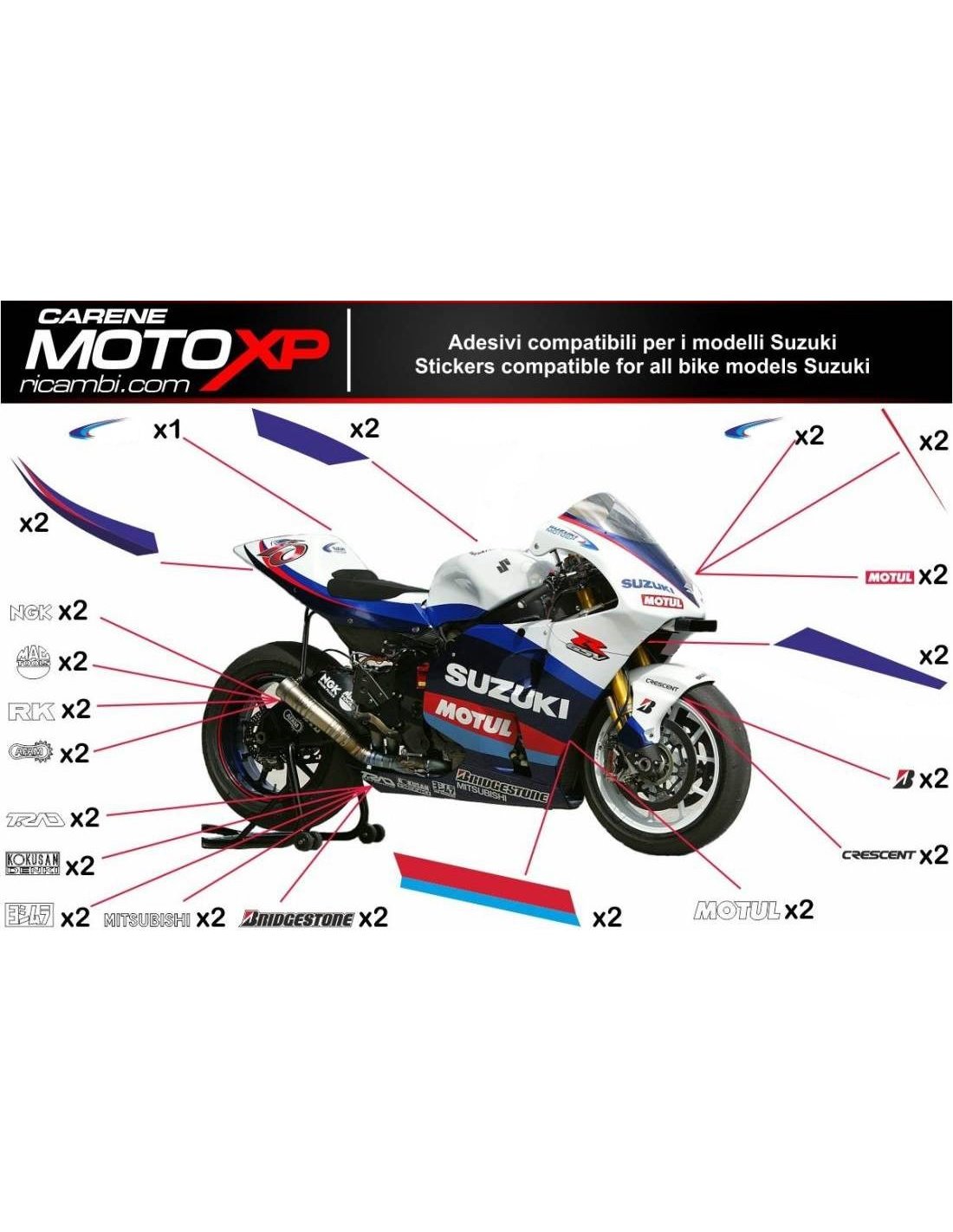 Gli adesivi sono realizzati con materiali di prima qualità e vengono dimensionati per il tipo di moto indicata al momento dell’acquisto. Il kit è composto di tutti gli adesivi non originali, per completare la grafica scelta: per cupolino, carena destra e sinistra, serbatoio, puntale destro sinistro, codino, forcellone e parafango anteriore. Gli adesivi si possono anche personalizzare (colore, numeri nomi o altro) scrivete tutto prima di aggiungere al carrello nello spazio “ulteriori informazioni”. Il costo del kit adesivi non varia, eccetto sostanziali modifiche ad esso (es. colori fluorescenti). Con l’acquisto, si accettano le condizioni di vendita.Si possono attaccare sia sopra che sotto trasparente. Salvo diversa richiesta del cliente, il kit viene fornito con la protezione applicata.