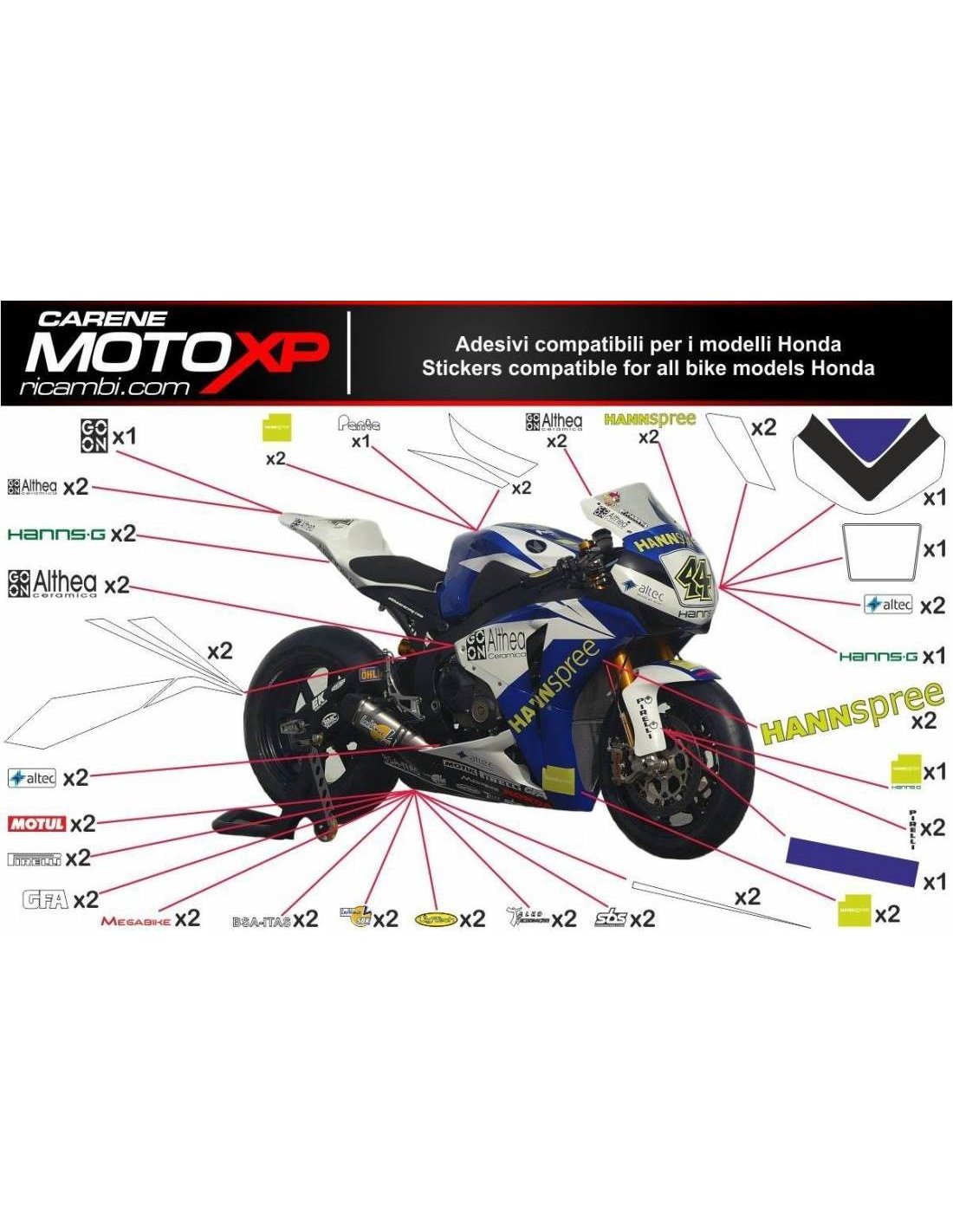 Gli adesivi sono realizzati con materiali di prima qualità e vengono dimensionati per il tipo di moto indicata al momento dell’acquisto. Il kit è composto di tutti gli adesivi non originali, per completare la grafica scelta: per cupolino, carena destra e sinistra, serbatoio, puntale destro sinistro, codino, forcellone e parafango anteriore. Gli adesivi si possono anche personalizzare (colore, numeri nomi o altro) scrivete tutto prima di aggiungere al carrello nello spazio “ulteriori informazioni”. Il costo del kit adesivi non varia, eccetto sostanziali modifiche ad esso (es. colori fluorescenti). Con l’acquisto, si accettano le condizioni di vendita.Si possono attaccare sia sopra che sotto trasparente. Salvo diversa richiesta del cliente, il kit viene fornito con la protezione applicata.