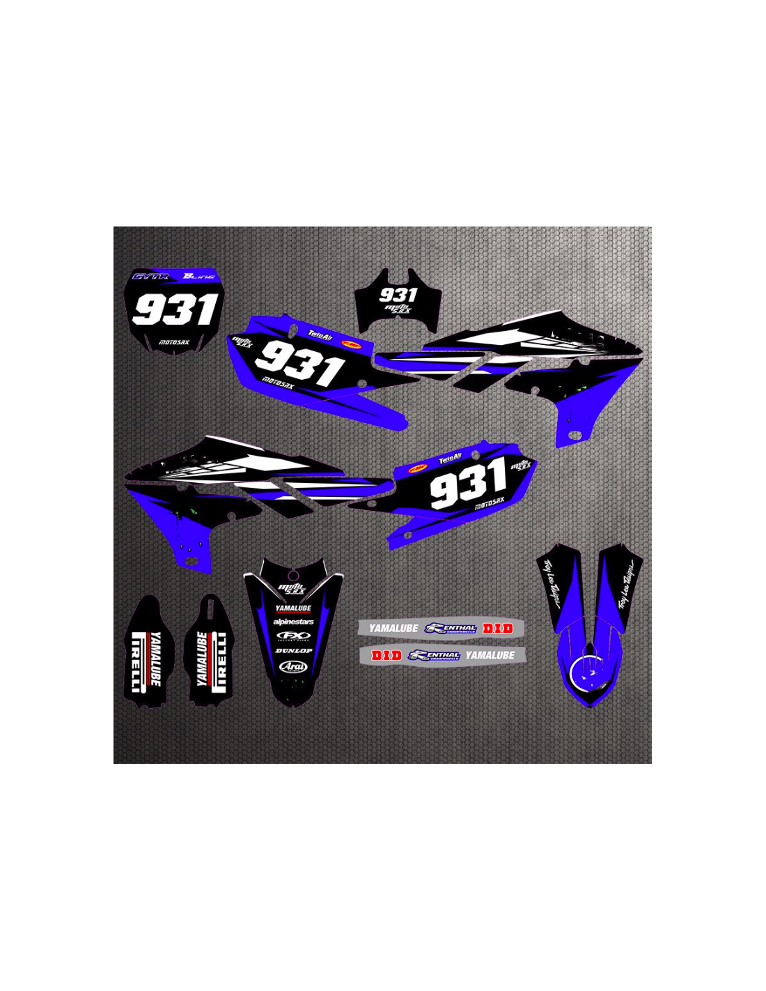 Gli adesivi sono realizzati con materiali crystal di prima qualità che permettono di adattarsi facilmente e perfettamente alle plastiche della moto del cliente. La resistenza del materiale permette alle nostre grafiche di rimanere correttamente incollate anche durante le più difficili condizioni di uso della moto. Il montaggio, grazie ai canali per lo scarico dell’aria, consente di installare agevolmente il prodotto e senza bolle. Utilizziamo macchinari di ultima generazione per la stampa, permettendo di stampare colori brillanti e sfumature in alta definizione. Sugli adesivi includiamo uno strato protettivo che riesce a mantenerli sempre lucenti nel corso degli anni, preservandoli anche da acqua e sporco. È possibile personalizzare il kit adesivi a proprio piacimento. Si possono aggiungere, togliere o sostituire sponsor tecnici, inserire un numero da gara personalizzato o il proprio nome. Si possono indicare tutte le modifiche nell’apposito spazio “Personalizzazione del prodotto” al momento dell’acquisto. Non ci limitiamo solo alle grafiche presenti sul nostro sito, inviandoci tramite mail o WhatsApp la foto di una grafica che non abbiamo, potremo farvi un preventivo e successivamente realizzarla. Con l’acquisto, si accettano le condizioni di vendita.