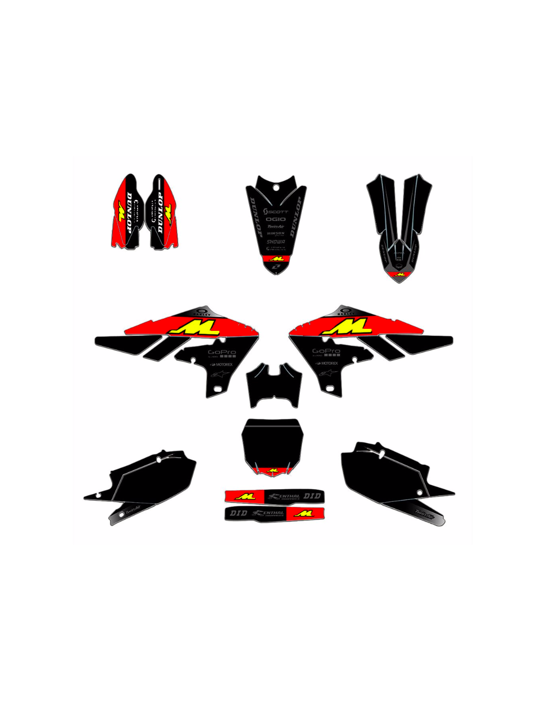Gli adesivi sono realizzati con materiali crystal di prima qualità che permettono di adattarsi facilmente e perfettamente alle plastiche della moto del cliente. La resistenza del materiale permette alle nostre grafiche di rimanere correttamente incollate anche durante le più difficili condizioni di uso della moto. Il montaggio, grazie ai canali per lo scarico dell’aria, consente di installare agevolmente il prodotto e senza bolle. Utilizziamo macchinari di ultima generazione per la stampa, permettendo di stampare colori brillanti e sfumature in alta definizione. Sugli adesivi includiamo uno strato protettivo che riesce a mantenerli sempre lucenti nel corso degli anni, preservandoli anche da acqua e sporco. È possibile personalizzare il kit adesivi a proprio piacimento. Si possono aggiungere, togliere o sostituire sponsor tecnici, inserire un numero da gara personalizzato o il proprio nome. Si possono indicare tutte le modifiche nell’apposito spazio “Personalizzazione del prodotto” al momento dell’acquisto. Non ci limitiamo solo alle grafiche presenti sul nostro sito, inviandoci tramite mail o WhatsApp la foto di una grafica che non abbiamo, potremo farvi un preventivo e successivamente realizzarla. Con l’acquisto, si accettano le condizioni di vendita.