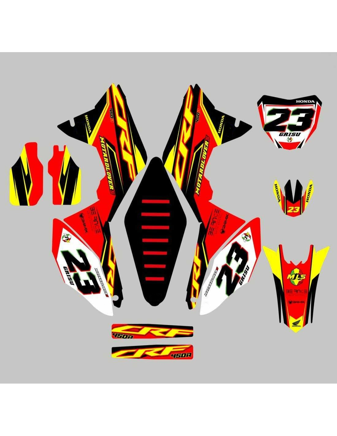 Gli adesivi sono realizzati con materiali crystal di prima qualità che permettono di adattarsi facilmente e perfettamente alle plastiche della moto del cliente. La resistenza del materiale permette alle nostre grafiche di rimanere correttamente incollate anche durante le più difficili condizioni di uso della moto. Il montaggio, grazie ai canali per lo scarico dell’aria, consente di installare agevolmente il prodotto e senza bolle. Utilizziamo macchinari di ultima generazione per la stampa, permettendo di stampare colori brillanti e sfumature in alta definizione. Sugli adesivi includiamo uno strato protettivo che riesce a mantenerli sempre lucenti nel corso degli anni, preservandoli anche da acqua e sporco. È possibile personalizzare il kit adesivi a proprio piacimento. Si possono aggiungere, togliere o sostituire sponsor tecnici, inserire un numero da gara personalizzato o il proprio nome. Si possono indicare tutte le modifiche nell’apposito spazio “Personalizzazione del prodotto” al momento dell’acquisto. Non ci limitiamo solo alle grafiche presenti sul nostro sito, inviandoci tramite mail o WhatsApp la foto di una grafica che non abbiamo, potremo farvi un preventivo e successivamente realizzarla. Con l’acquisto, si accettano le condizioni di vendita.