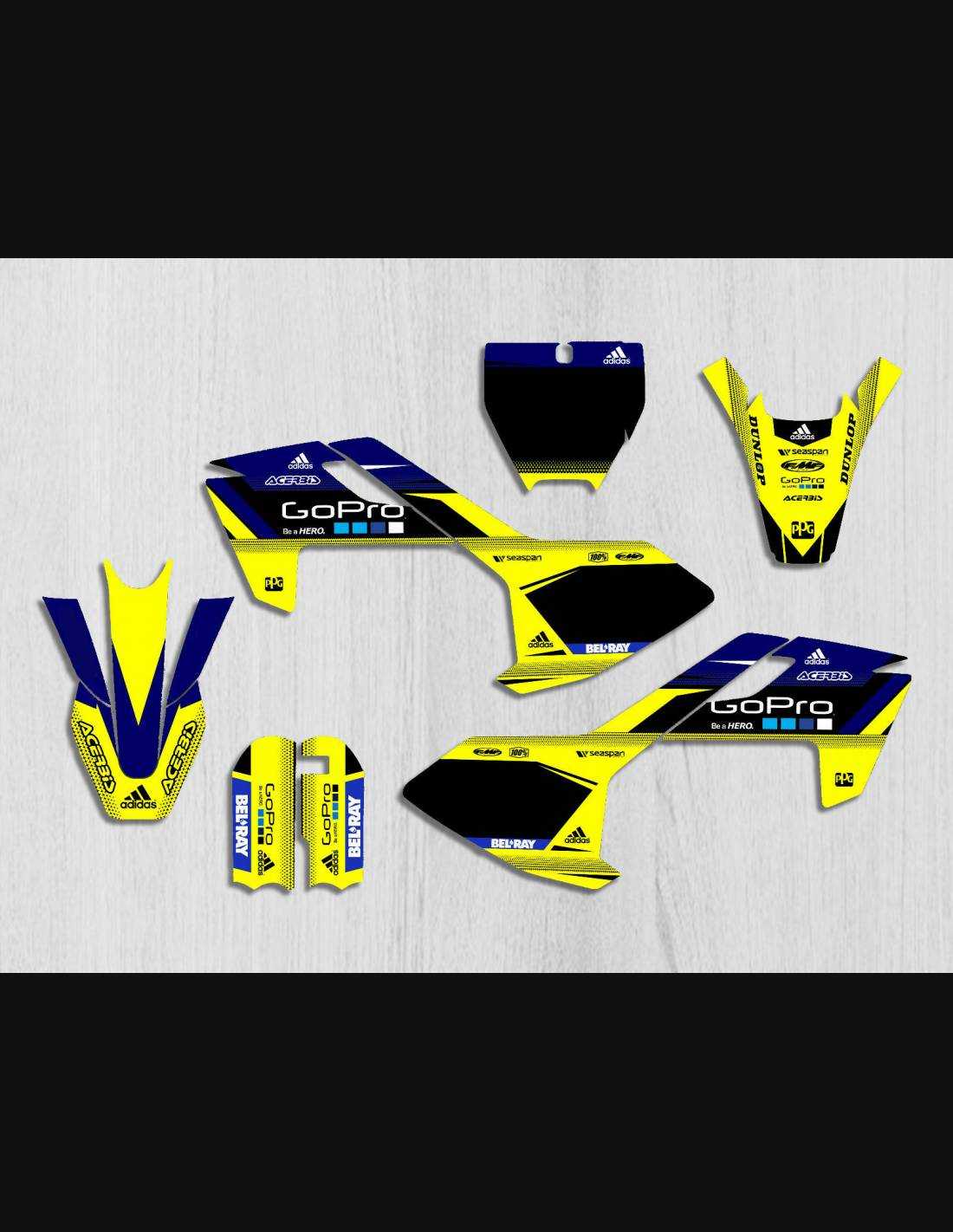 Gli adesivi sono realizzati con materiali crystal di prima qualità che permettono di adattarsi facilmente e perfettamente alle plastiche della moto del cliente. La resistenza del materiale permette alle nostre grafiche di rimanere correttamente incollate anche durante le più difficili condizioni di uso della moto. Il montaggio, grazie ai canali per lo scarico dell’aria, consente di installare agevolmente il prodotto e senza bolle. Utilizziamo macchinari di ultima generazione per la stampa, permettendo di stampare colori brillanti e sfumature in alta definizione. Sugli adesivi includiamo uno strato protettivo che riesce a mantenerli sempre lucenti nel corso degli anni, preservandoli anche da acqua e sporco. È possibile personalizzare il kit adesivi a proprio piacimento. Si possono aggiungere, togliere o sostituire sponsor tecnici, inserire un numero da gara personalizzato o il proprio nome. Si possono indicare tutte le modifiche nell’apposito spazio “Personalizzazione del prodotto” al momento dell’acquisto. Non ci limitiamo solo alle grafiche presenti sul nostro sito, inviandoci tramite mail o WhatsApp la foto di una grafica che non abbiamo, potremo farvi un preventivo e successivamente realizzarla. Con l’acquisto, si accettano le condizioni di vendita.