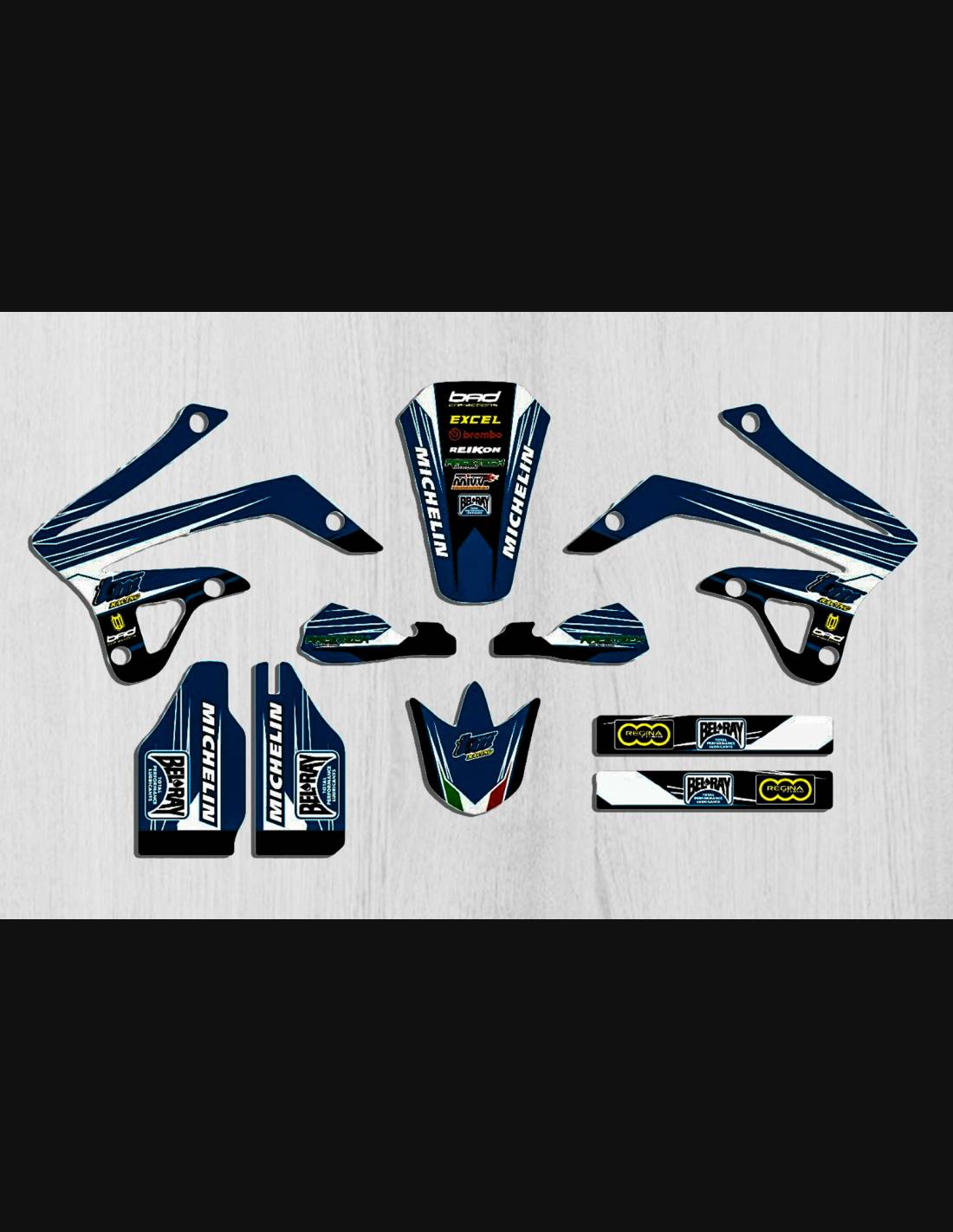 Gli adesivi sono realizzati con materiali crystal di prima qualità che permettono di adattarsi facilmente e perfettamente alle plastiche della moto del cliente. La resistenza del materiale permette alle nostre grafiche di rimanere correttamente incollate anche durante le più difficili condizioni di uso della moto. Il montaggio, grazie ai canali per lo scarico dell’aria, consente di installare agevolmente il prodotto e senza bolle. Utilizziamo macchinari di ultima generazione per la stampa, permettendo di stampare colori brillanti e sfumature in alta definizione. Sugli adesivi includiamo uno strato protettivo che riesce a mantenerli sempre lucenti nel corso degli anni, preservandoli anche da acqua e sporco. È possibile personalizzare il kit adesivi a proprio piacimento. Si possono aggiungere, togliere o sostituire sponsor tecnici, inserire un numero da gara personalizzato o il proprio nome. Si possono indicare tutte le modifiche nell’apposito spazio “Personalizzazione del prodotto” al momento dell’acquisto. Non ci limitiamo solo alle grafiche presenti sul nostro sito, inviandoci tramite mail o WhatsApp la foto di una grafica che non abbiamo, potremo farvi un preventivo e successivamente realizzarla. Con l’acquisto, si accettano le condizioni di vendita.