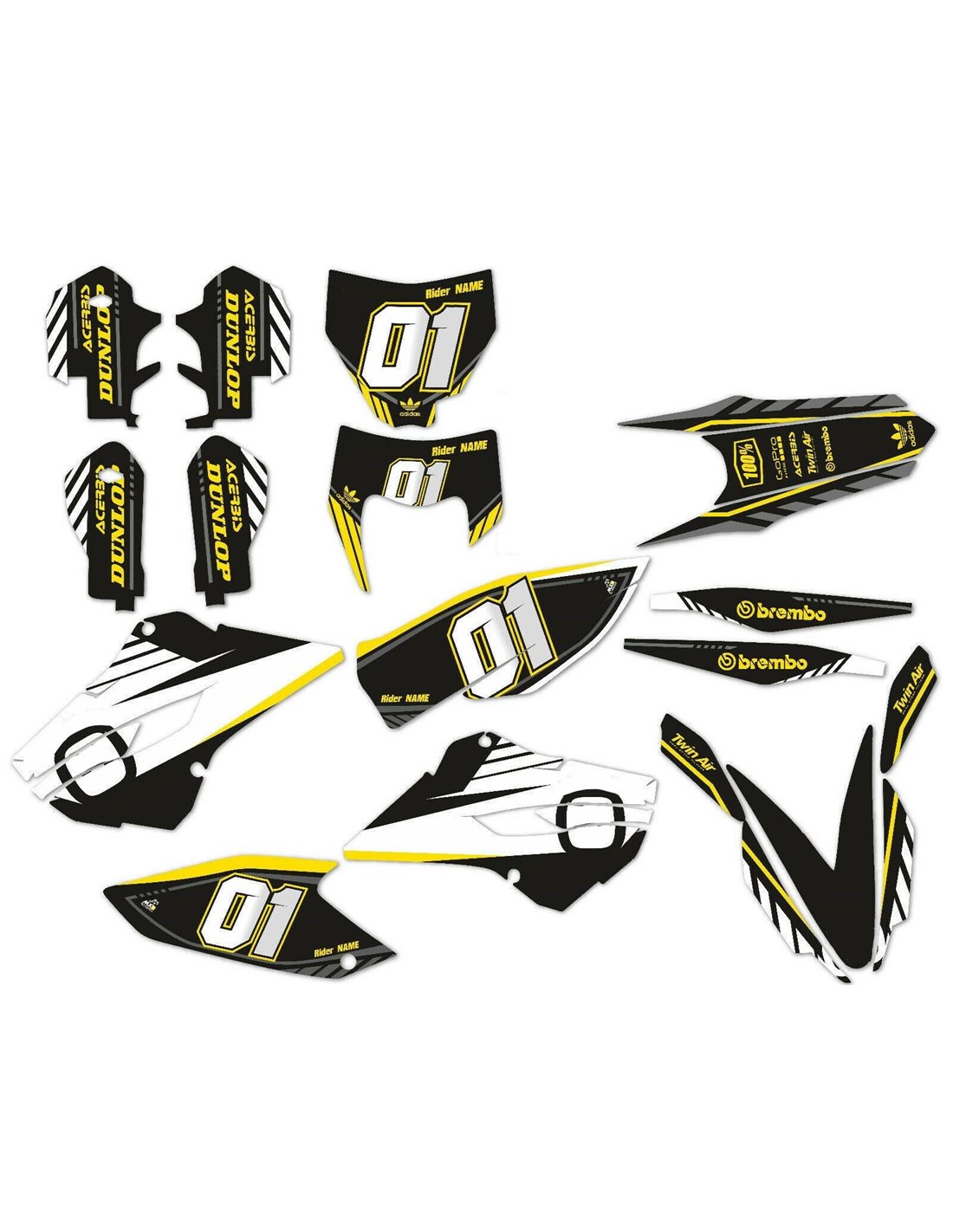 Gli adesivi sono realizzati con materiali crystal di prima qualità che permettono di adattarsi facilmente e perfettamente alle plastiche della moto del cliente. La resistenza del materiale permette alle nostre grafiche di rimanere correttamente incollate anche durante le più difficili condizioni di uso della moto. Il montaggio, grazie ai canali per lo scarico dell’aria, consente di installare agevolmente il prodotto e senza bolle. Utilizziamo macchinari di ultima generazione per la stampa, permettendo di stampare colori brillanti e sfumature in alta definizione. Sugli adesivi includiamo uno strato protettivo che riesce a mantenerli sempre lucenti nel corso degli anni, preservandoli anche da acqua e sporco. È possibile personalizzare il kit adesivi a proprio piacimento. Si possono aggiungere, togliere o sostituire sponsor tecnici, inserire un numero da gara personalizzato o il proprio nome. Si possono indicare tutte le modifiche nell’apposito spazio “Personalizzazione del prodotto” al momento dell’acquisto. Non ci limitiamo solo alle grafiche presenti sul nostro sito, inviandoci tramite mail o WhatsApp la foto di una grafica che non abbiamo, potremo farvi un preventivo e successivamente realizzarla. Con l’acquisto, si accettano le condizioni di vendita.
