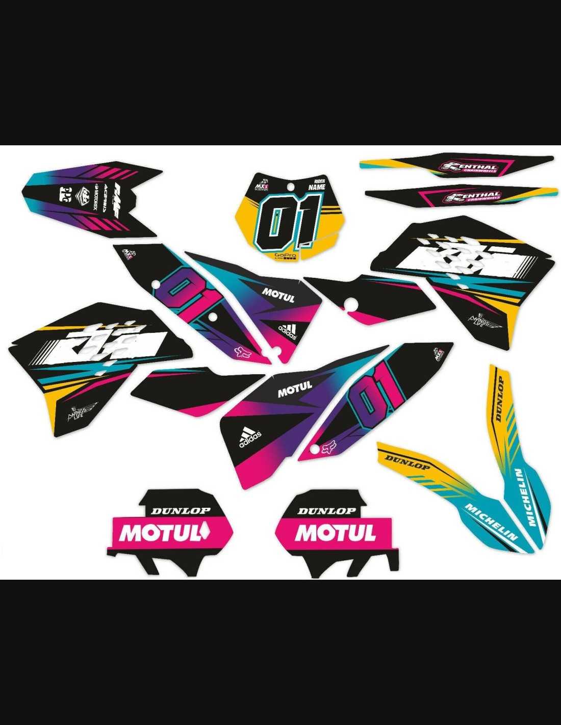 Gli adesivi sono realizzati con materiali crystal di prima qualità che permettono di adattarsi facilmente e perfettamente alle plastiche della moto del cliente. La resistenza del materiale permette alle nostre grafiche di rimanere correttamente incollate anche durante le più difficili condizioni di uso della moto. Il montaggio, grazie ai canali per lo scarico dell’aria, consente di installare agevolmente il prodotto e senza bolle. Utilizziamo macchinari di ultima generazione per la stampa, permettendo di stampare colori brillanti e sfumature in alta definizione. Sugli adesivi includiamo uno strato protettivo che riesce a mantenerli sempre lucenti nel corso degli anni, preservandoli anche da acqua e sporco. È possibile personalizzare il kit adesivi a proprio piacimento. Si possono aggiungere, togliere o sostituire sponsor tecnici, inserire un numero da gara personalizzato o il proprio nome. Si possono indicare tutte le modifiche nell’apposito spazio “Personalizzazione del prodotto” al momento dell’acquisto. Non ci limitiamo solo alle grafiche presenti sul nostro sito, inviandoci tramite mail o WhatsApp la foto di una grafica che non abbiamo, potremo farvi un preventivo e successivamente realizzarla. Con l’acquisto, si accettano le condizioni di vendita.