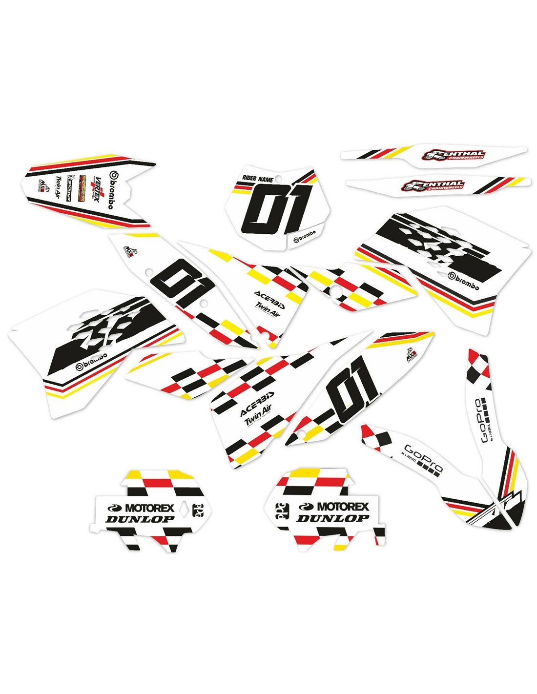 Gli adesivi sono realizzati con materiali crystal di prima qualità che permettono di adattarsi facilmente e perfettamente alle plastiche della moto del cliente. La resistenza del materiale permette alle nostre grafiche di rimanere correttamente incollate anche durante le più difficili condizioni di uso della moto. Il montaggio, grazie ai canali per lo scarico dell’aria, consente di installare agevolmente il prodotto e senza bolle. Utilizziamo macchinari di ultima generazione per la stampa, permettendo di stampare colori brillanti e sfumature in alta definizione. Sugli adesivi includiamo uno strato protettivo che riesce a mantenerli sempre lucenti nel corso degli anni, preservandoli anche da acqua e sporco. È possibile personalizzare il kit adesivi a proprio piacimento. Si possono aggiungere, togliere o sostituire sponsor tecnici, inserire un numero da gara personalizzato o il proprio nome. Si possono indicare tutte le modifiche nell’apposito spazio “Personalizzazione del prodotto” al momento dell’acquisto. Non ci limitiamo solo alle grafiche presenti sul nostro sito, inviandoci tramite mail o WhatsApp la foto di una grafica che non abbiamo, potremo farvi un preventivo e successivamente realizzarla. Con l’acquisto, si accettano le condizioni di vendita.