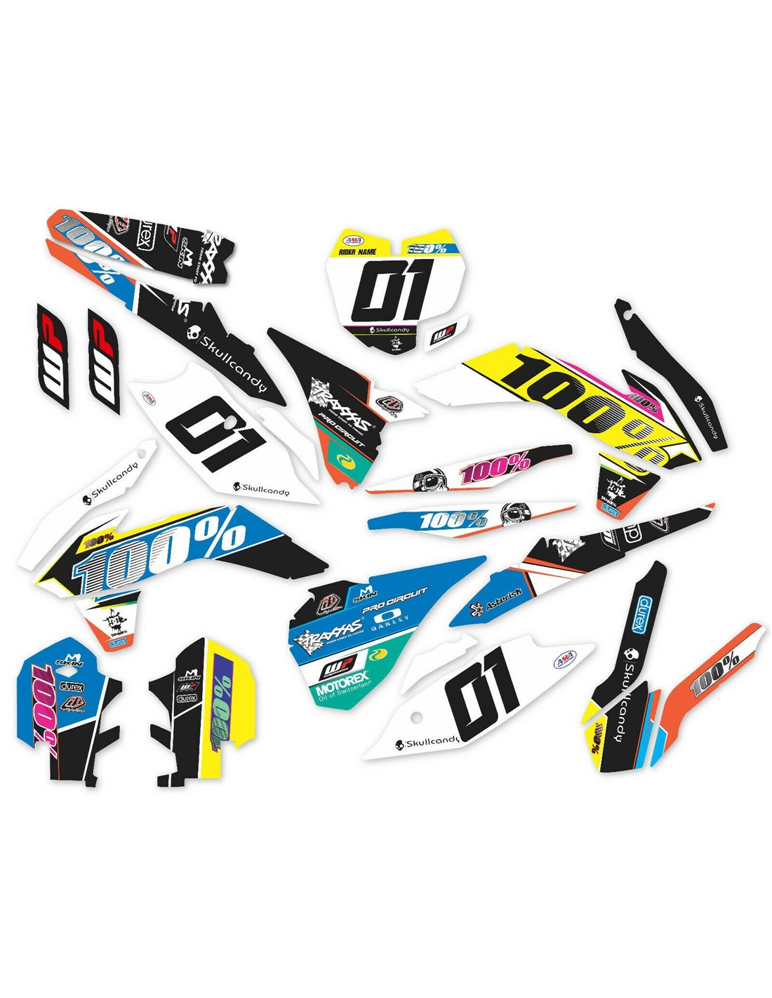 Gli adesivi sono realizzati con materiali crystal di prima qualità che permettono di adattarsi facilmente e perfettamente alle plastiche della moto del cliente. La resistenza del materiale permette alle nostre grafiche di rimanere correttamente incollate anche durante le più difficili condizioni di uso della moto. Il montaggio, grazie ai canali per lo scarico dell’aria, consente di installare agevolmente il prodotto e senza bolle. Utilizziamo macchinari di ultima generazione per la stampa, permettendo di stampare colori brillanti e sfumature in alta definizione. Sugli adesivi includiamo uno strato protettivo che riesce a mantenerli sempre lucenti nel corso degli anni, preservandoli anche da acqua e sporco. È possibile personalizzare il kit adesivi a proprio piacimento. Si possono aggiungere, togliere o sostituire sponsor tecnici, inserire un numero da gara personalizzato o il proprio nome. Si possono indicare tutte le modifiche nell’apposito spazio “Personalizzazione del prodotto” al momento dell’acquisto. Non ci limitiamo solo alle grafiche presenti sul nostro sito, inviandoci tramite mail o WhatsApp la foto di una grafica che non abbiamo, potremo farvi un preventivo e successivamente realizzarla. Con l’acquisto, si accettano le condizioni di vendita.