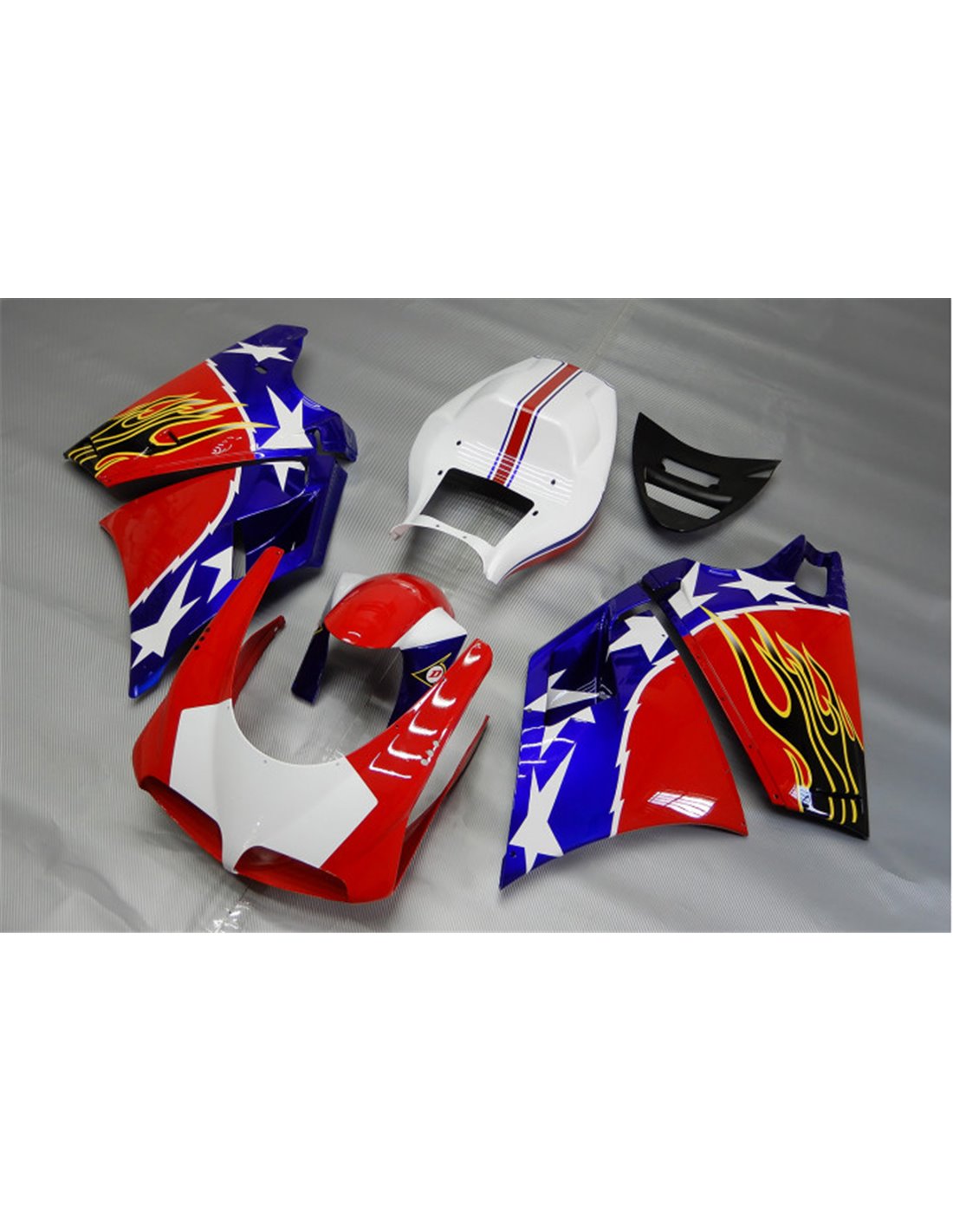 Elite: usiamo i colori compatibili con il serbatoio originale della moto (es. Rosso Ducati), le grafiche vengono stampate con le Varie Sfumature con Plotter da Stampa a 8 colori con inchiostri ECO-SOL MAX con qualità e resistenza ai raggi solari fino a 7 anni garantiti dalla Ditta APA Italia che ci fornisce i materiali, messi sotto tre strati di trasparente in modo che rimangano brillanti per anni, inoltre l’intera carena è verniciata all'interno.