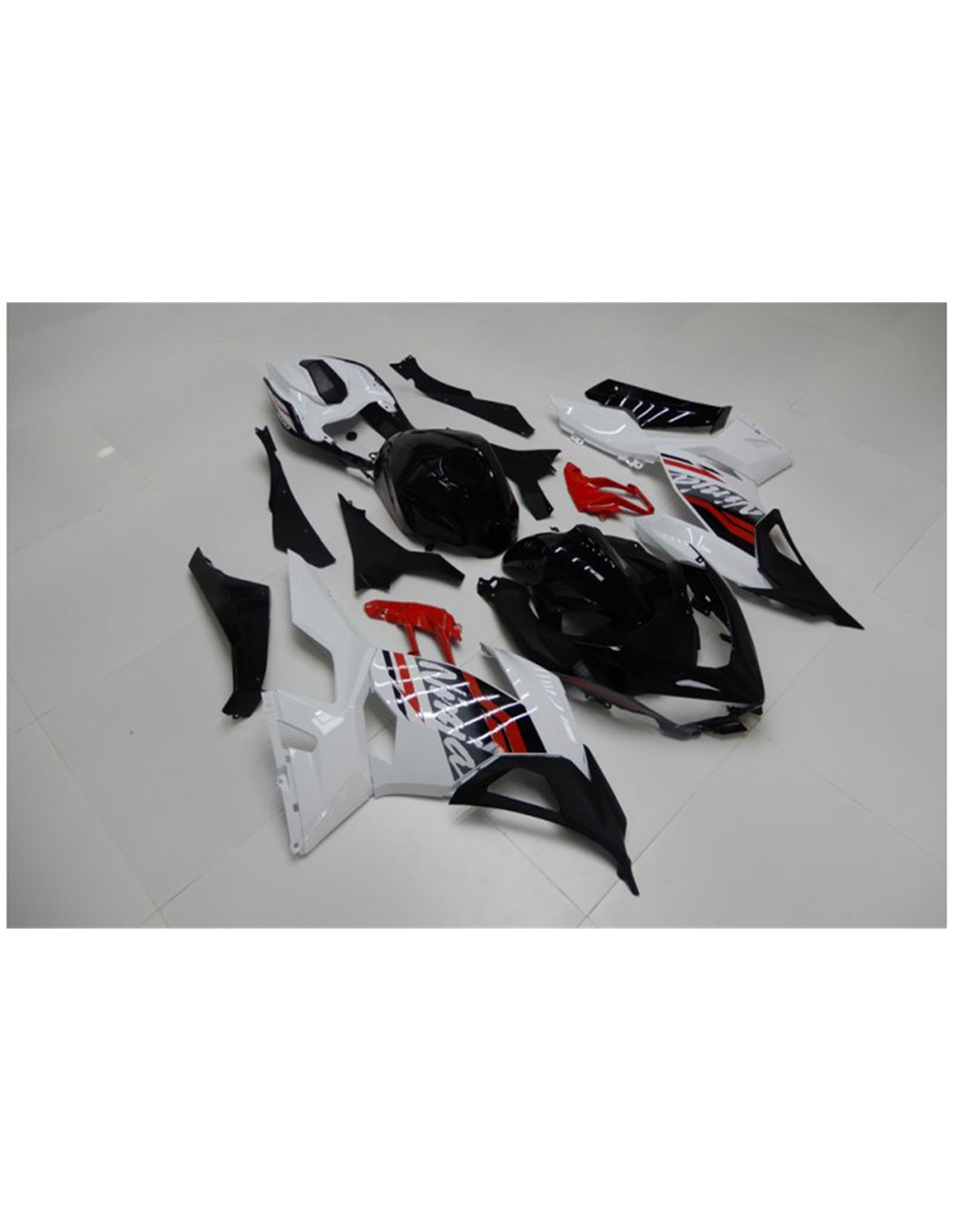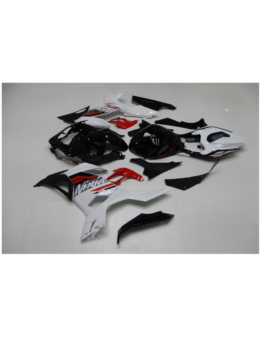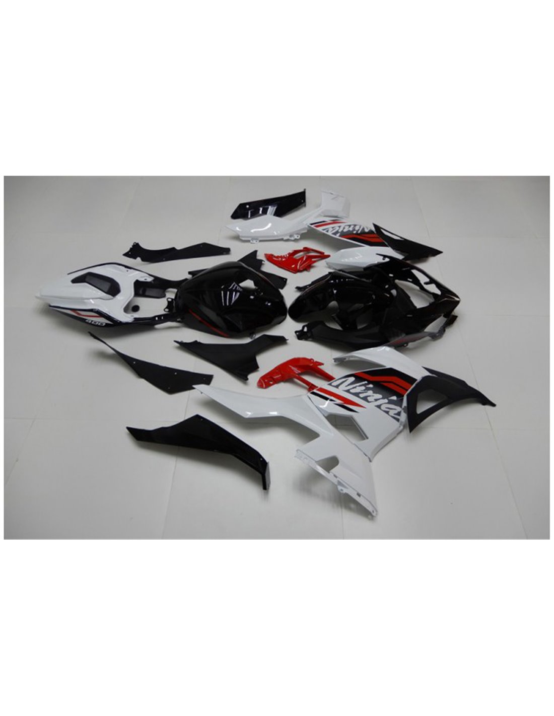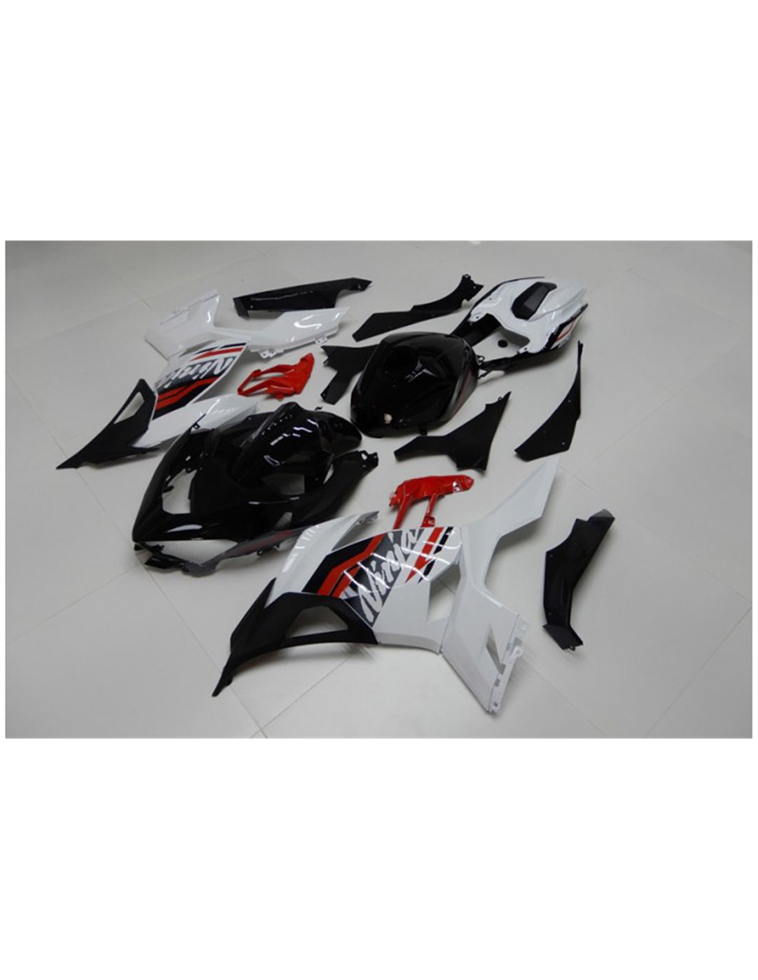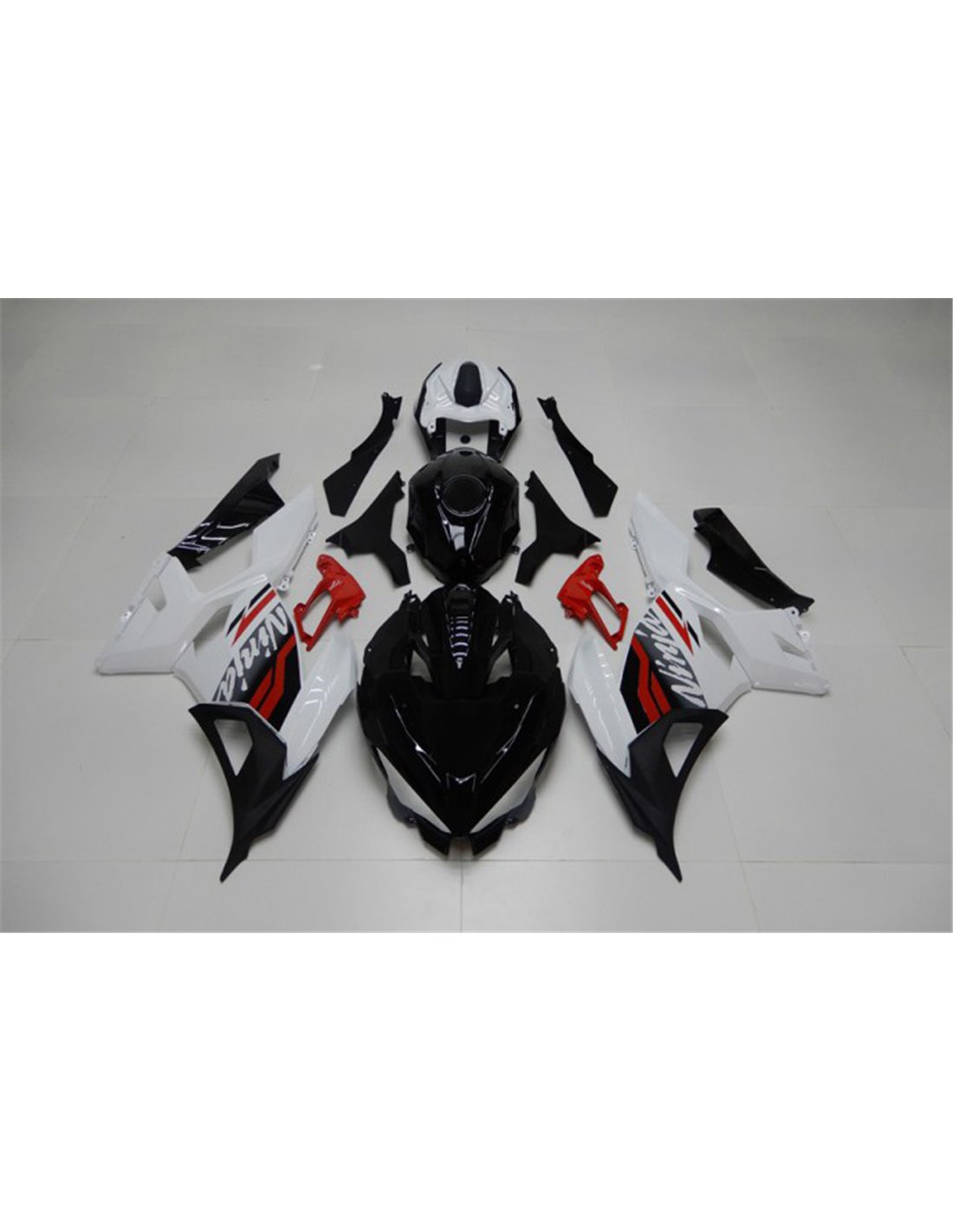 Il kit di carene complete comprende: cupolino, fianchi destro e sinistro, puntale destro e sinistro, codone, parafango anteriore e varie altre plastiche nere interne.