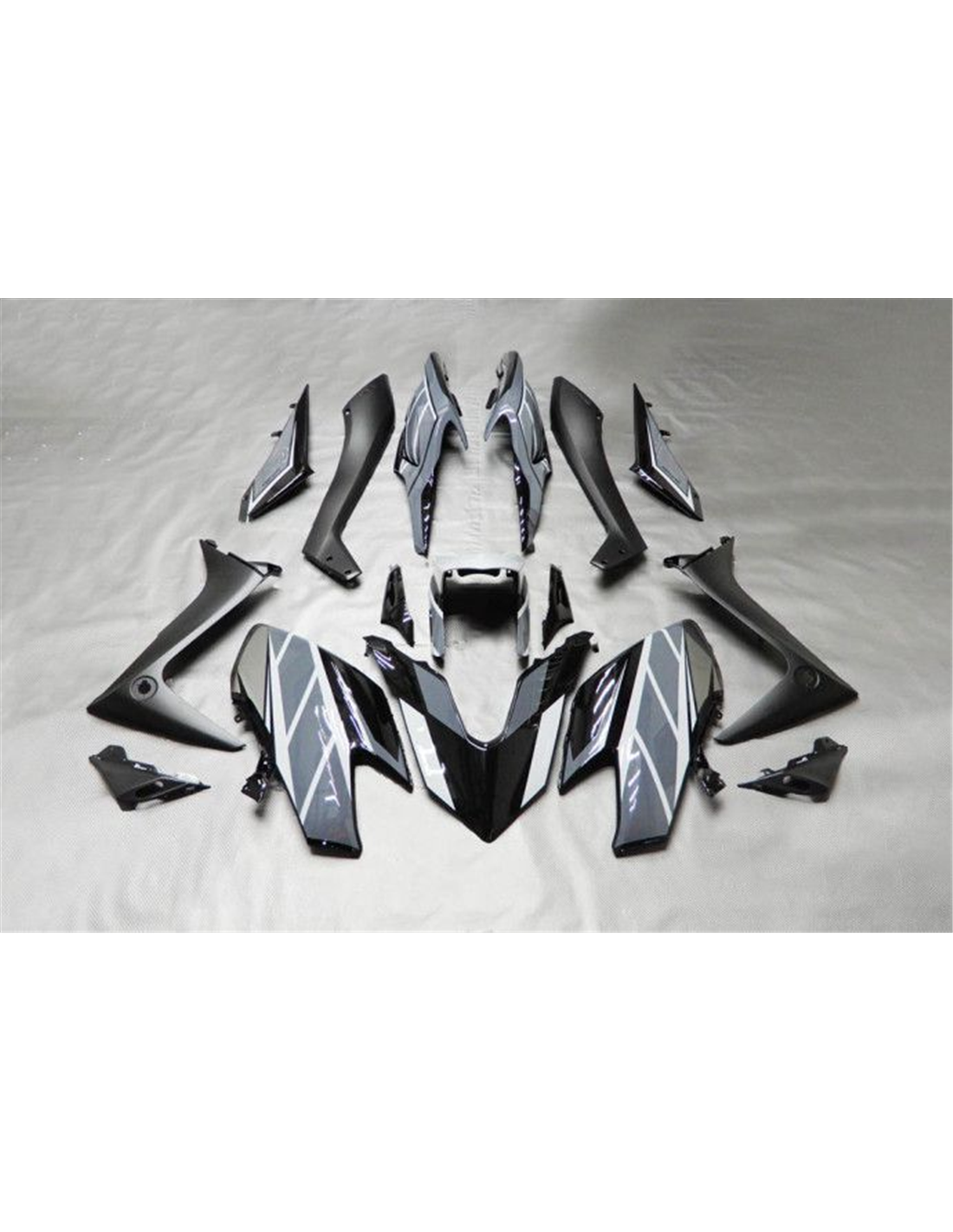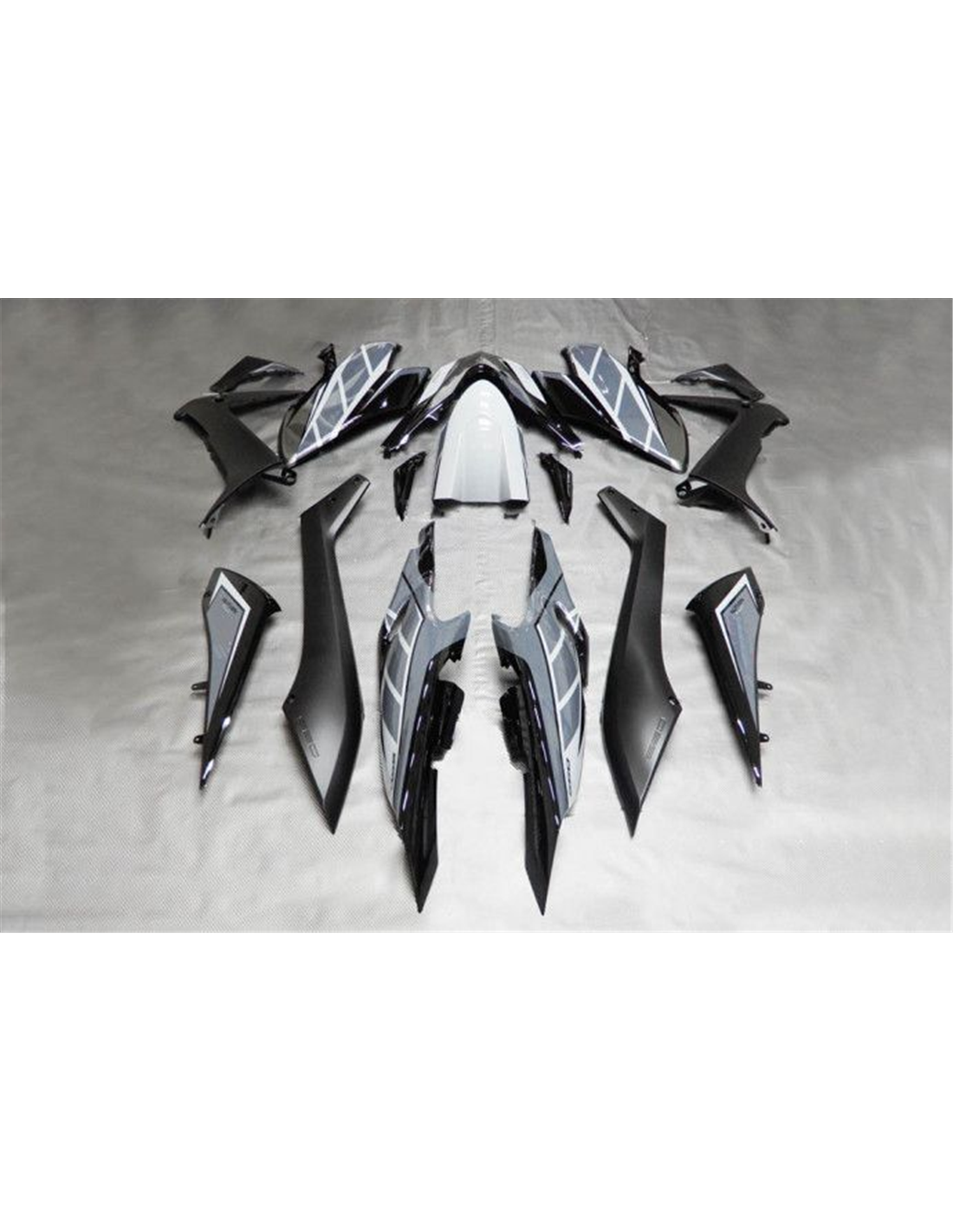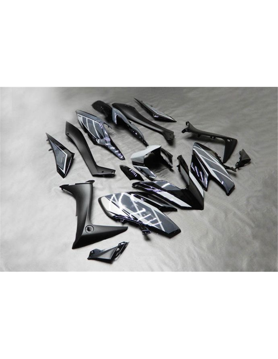 Il kit di carene complete comprende: cupolino, fianchi destro e sinistro, puntale destro e sinistro, codone, parafango anteriore e varie altre plastiche nere interne.