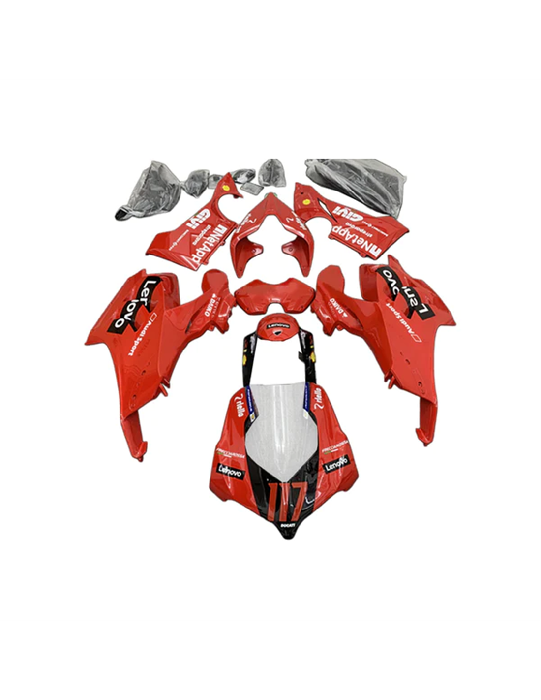Il kit di carene complete comprende: cupolino, fianchi destro e sinistro, puntale destro e sinistro, codone, parafango anteriore e varie altre plastiche nere interne.