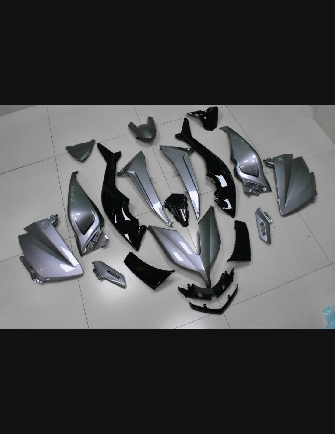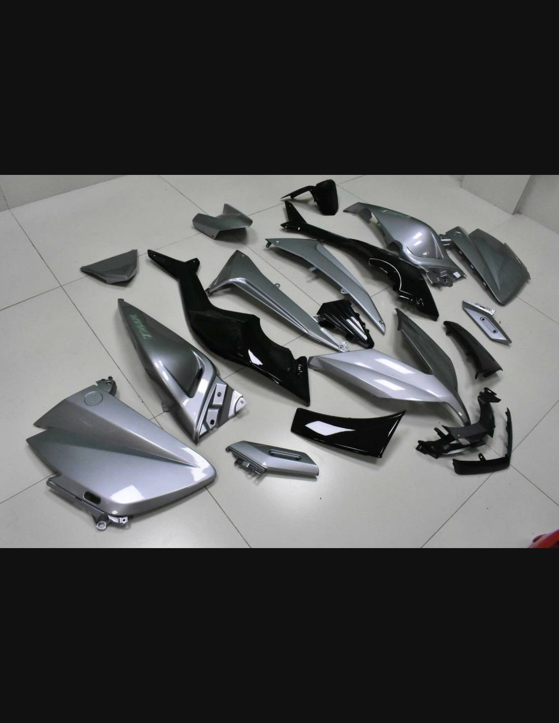 Il kit di carene complete comprende: cupolino, fianchi destro e sinistro, puntale destro e sinistro, codone, parafango anteriore e varie altre plastiche nere interne.