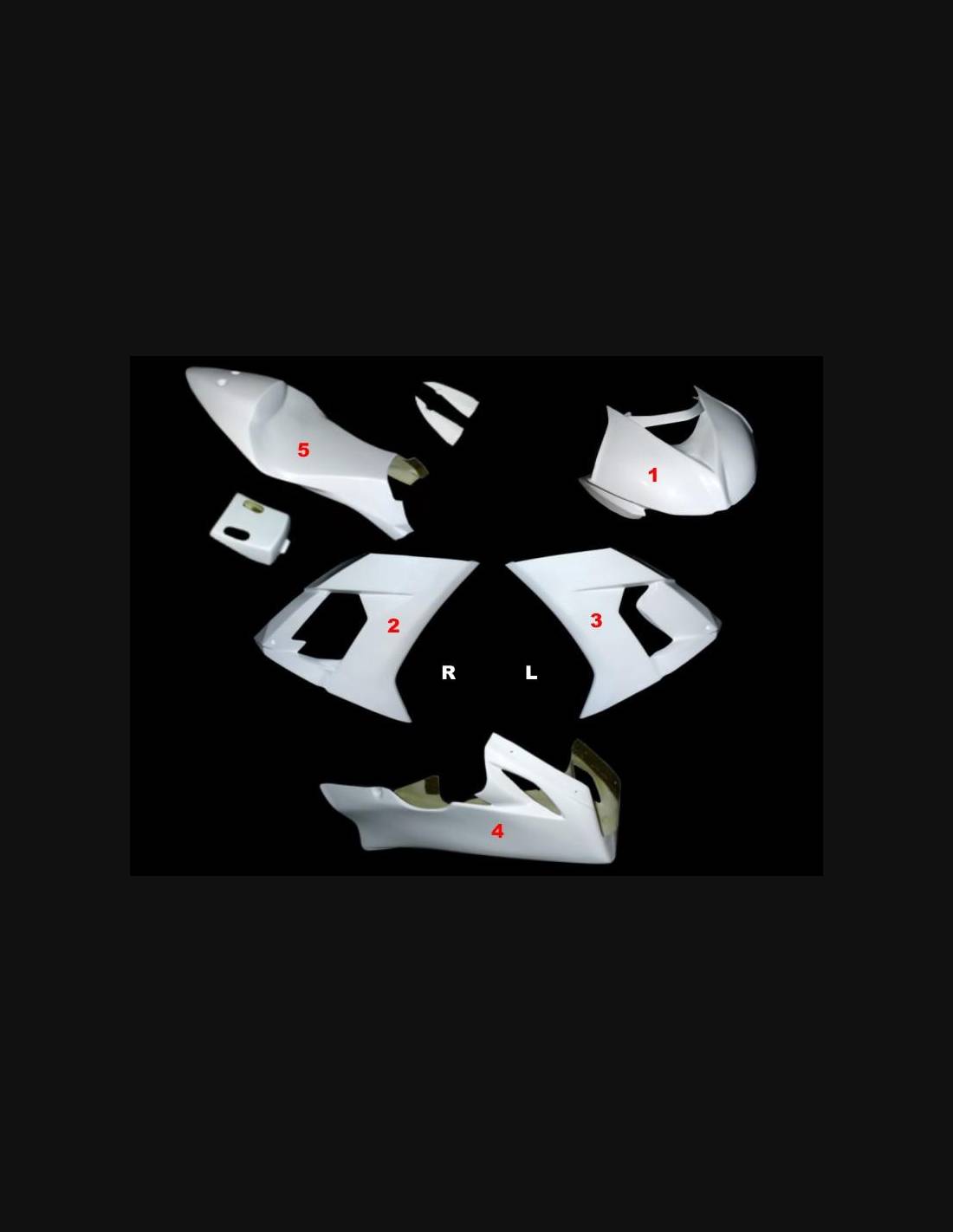 Il kit di carene comprende: cupolino, fianchi destro e sinistro, puntale a vasca e codone (il copriserbatoio non è incluso nel prezzo)