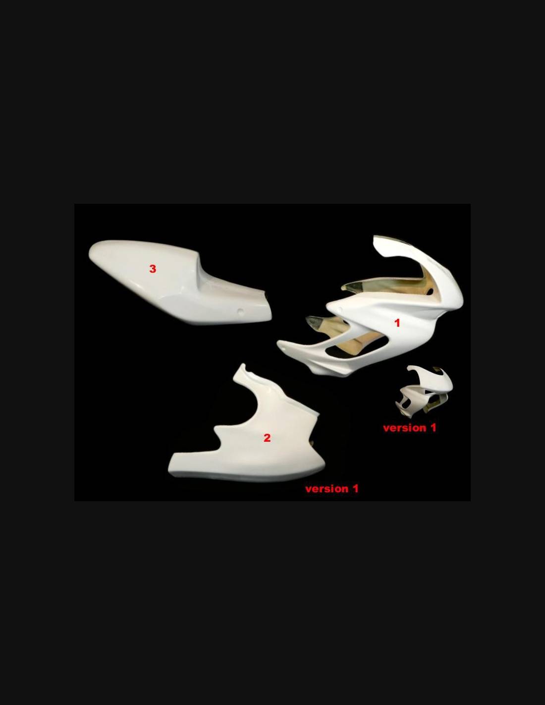 Il kit di carene comprende: cupolino, fianchi destro e sinistro, puntale a vasca e codone (il copriserbatoio non è incluso nel prezzo)