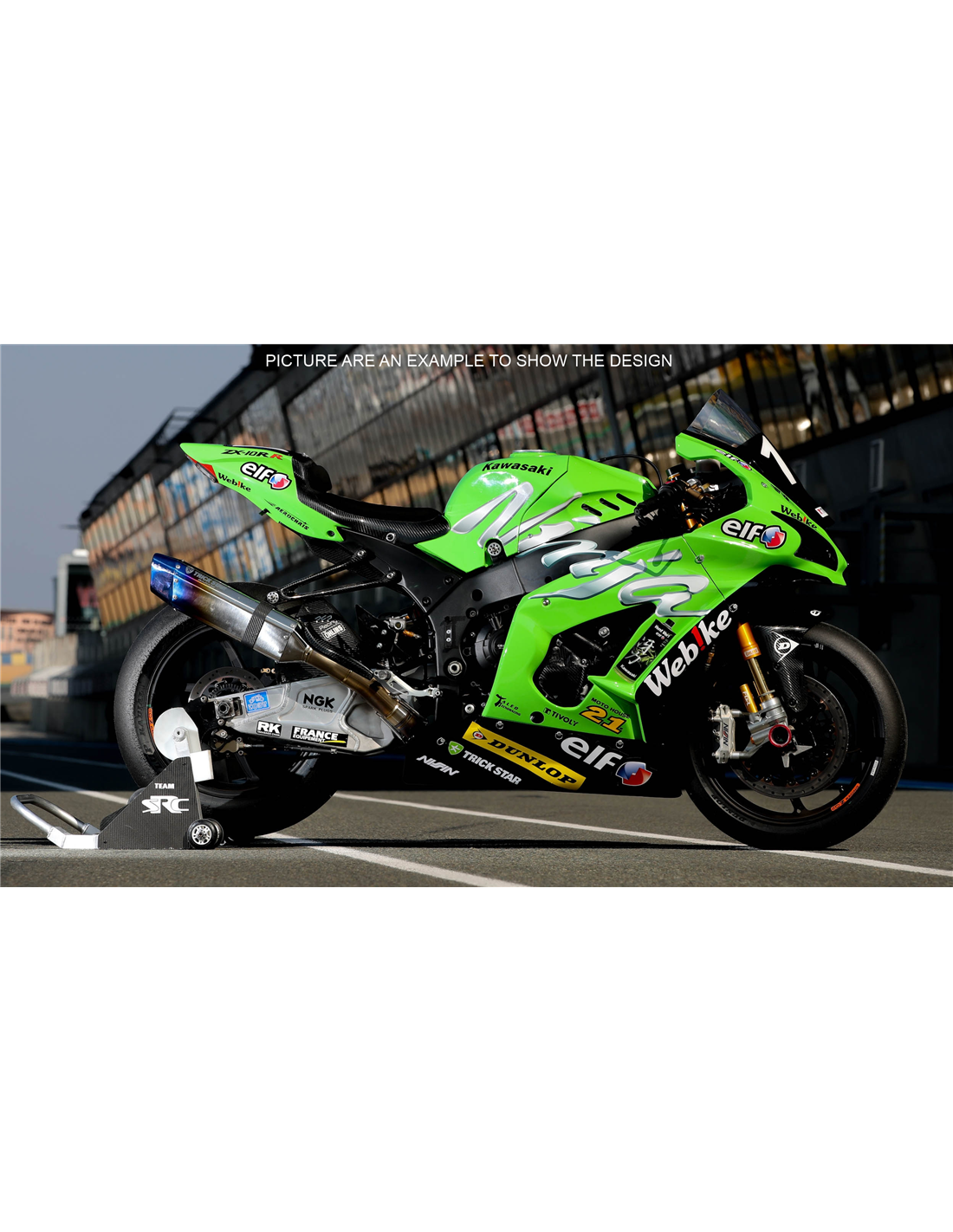 Elite: usiamo i colori compatibili con il serbatoio originale della moto (es. Verde Kawasaki). Gli adesivi vengono stampati utilizzando plotter a 8 colori che conferiscono lucentezza e sfumature impeccabili. Tutta la grafica viene posta sotto tre strati di trasparente per mantenere nel tempo i colori brillanti della carenatura. Inoltre l’intera carena è verniciata anche all'interno.
