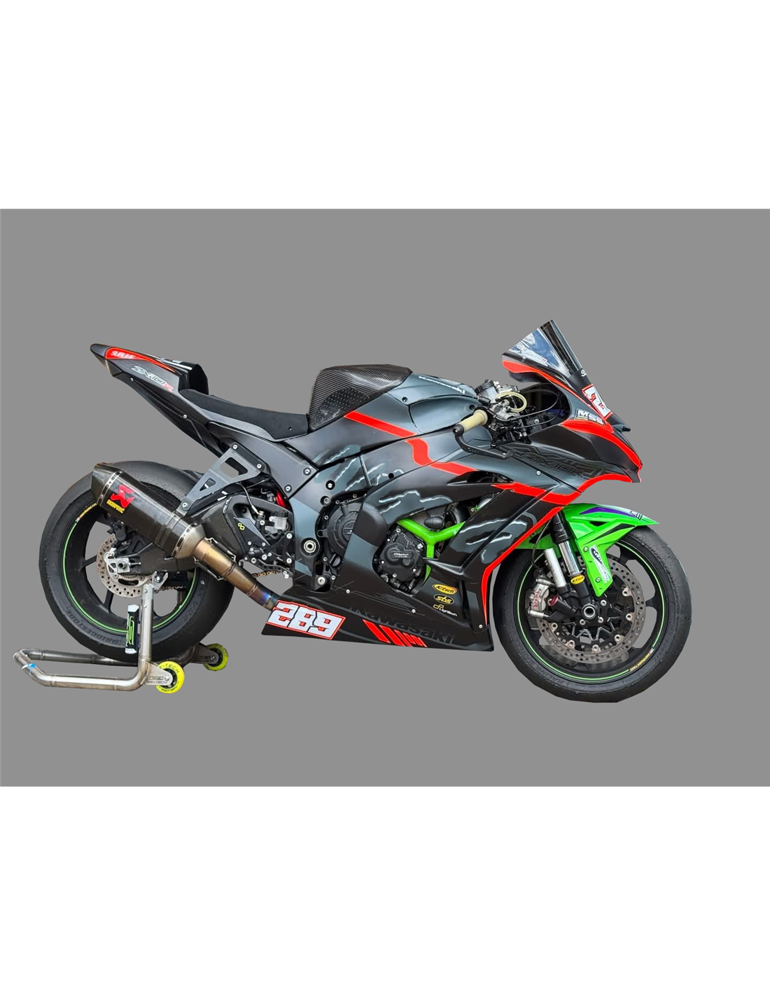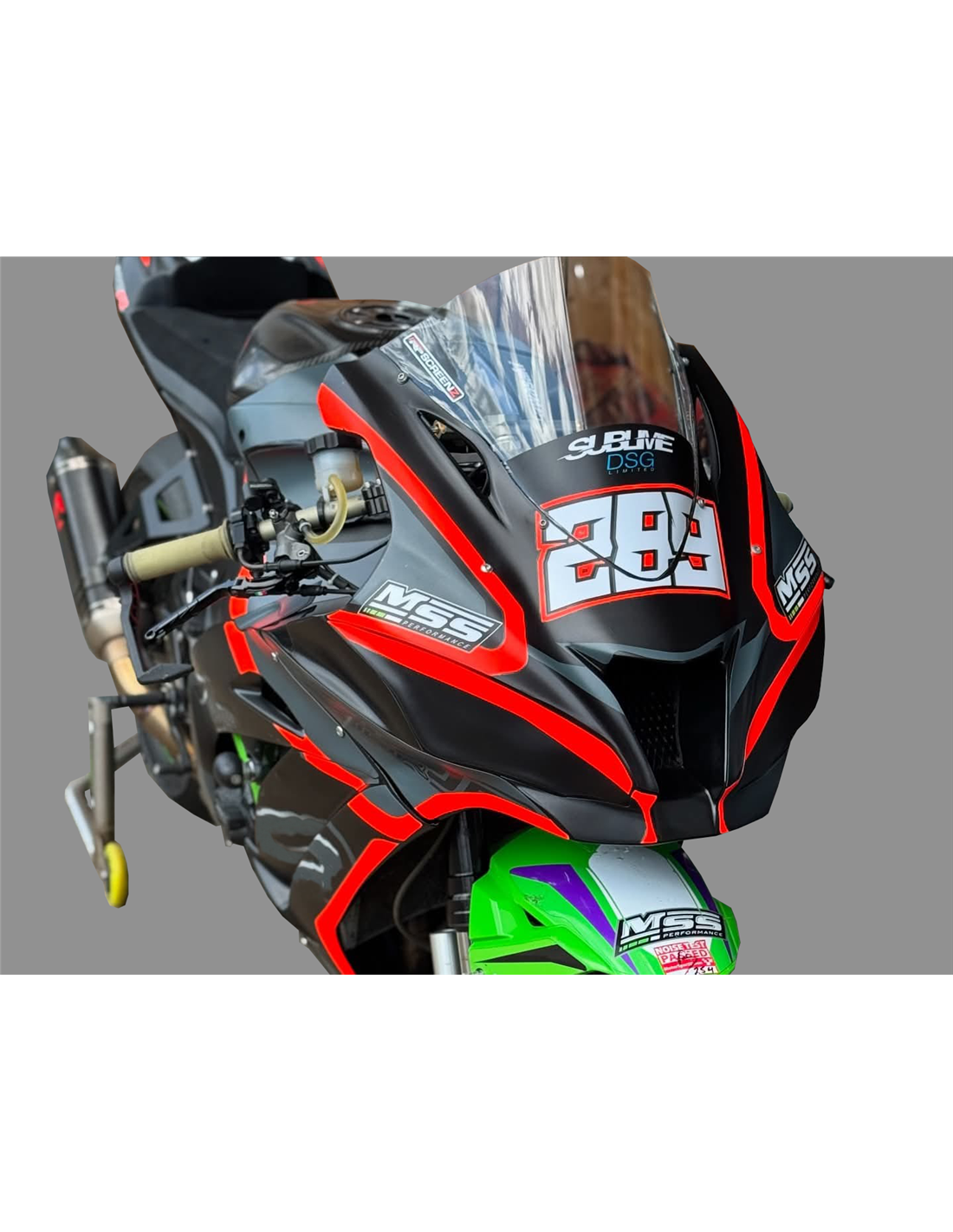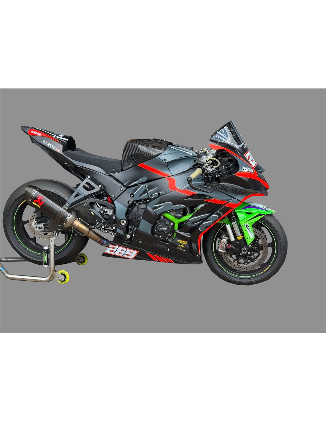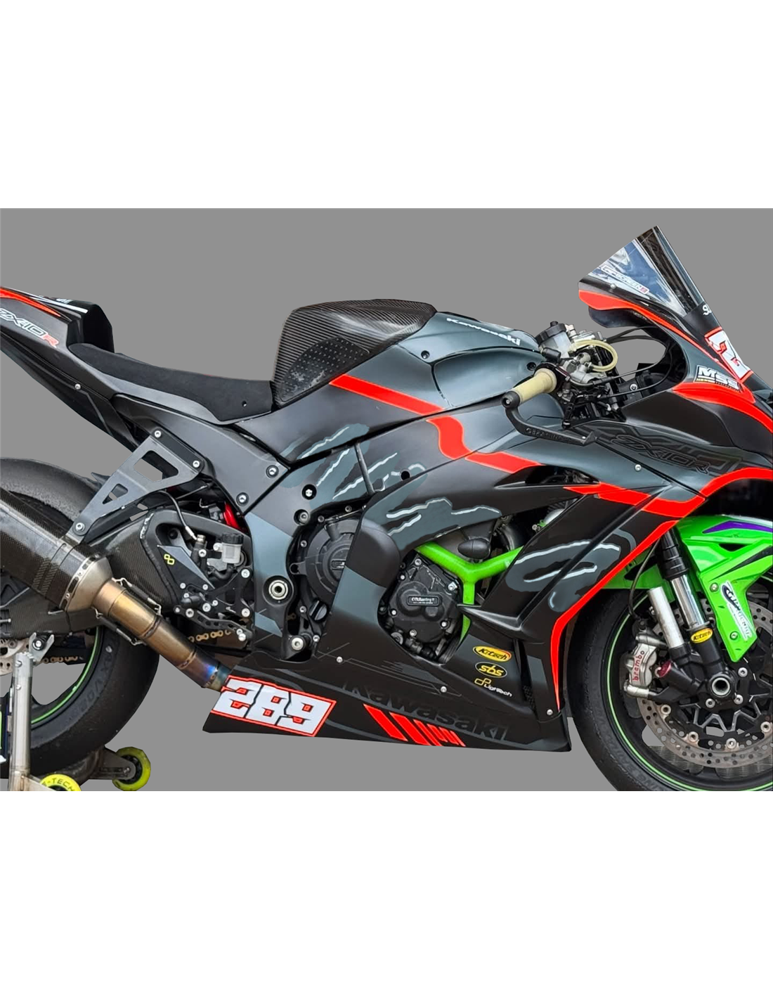 Elite: usiamo i colori compatibili con il serbatoio originale della moto (es. Verde Kawasaki). Gli adesivi vengono stampati utilizzando plotter a 8 colori che conferiscono lucentezza e sfumature impeccabili. Tutta la grafica viene posta sotto tre strati di trasparente per mantenere nel tempo i colori brillanti della carenatura. Inoltre l’intera carena è verniciata anche all'interno.