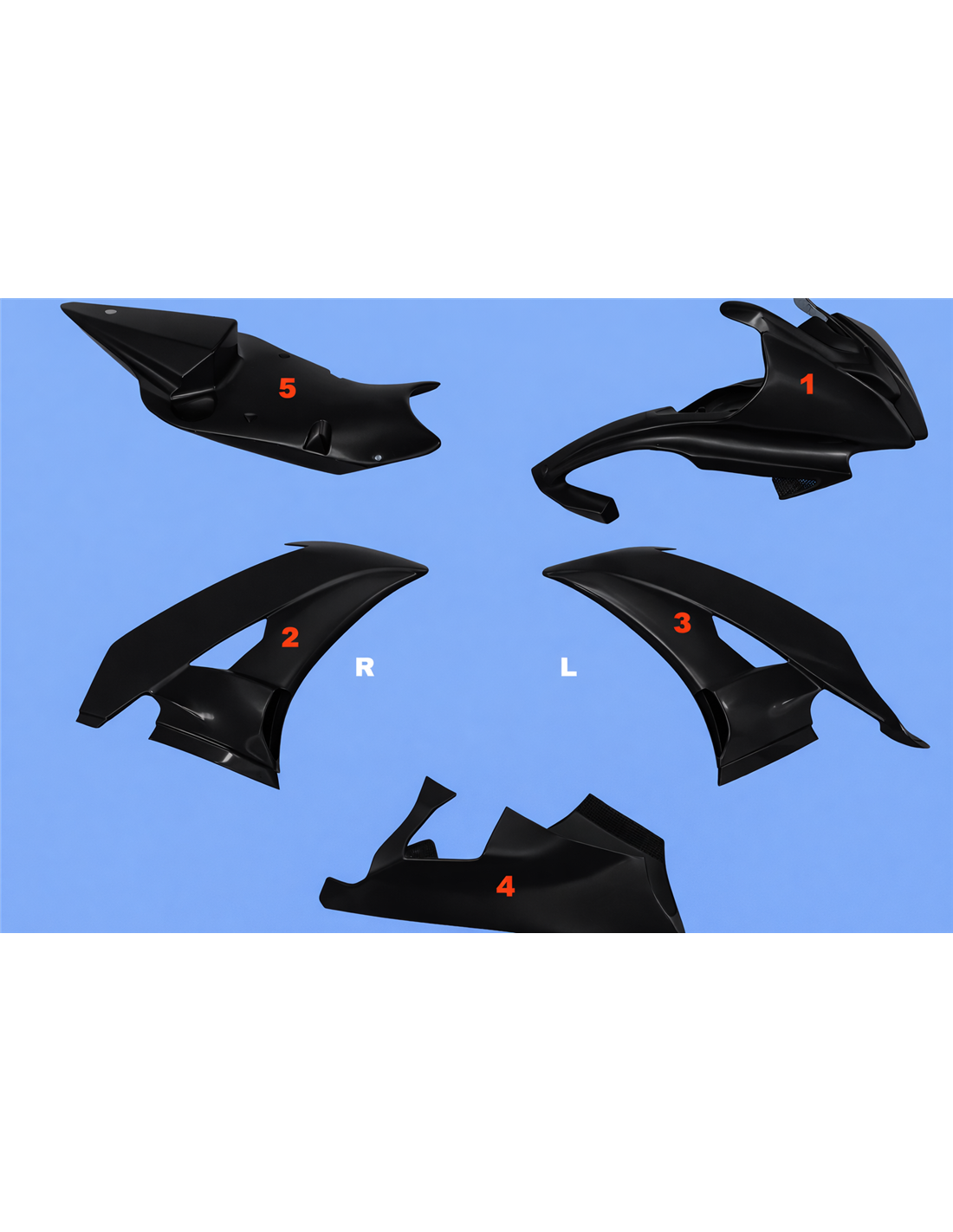 Il kit di carene comprende: cupolino, fianco destro e sinistro, vasca raccogli liquido chiusa ed omologata per la pista,codone (il copriserbatoio non è incluso nel prezzo).