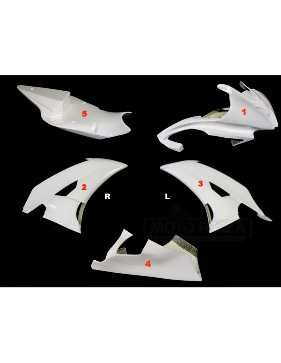 Il kit di carene comprende: cupolino, fianco destro e sinistro, vasca raccogli liquido chiusa ed omologata per la pista,codone (il copriserbatoio non è incluso nel prezzo).