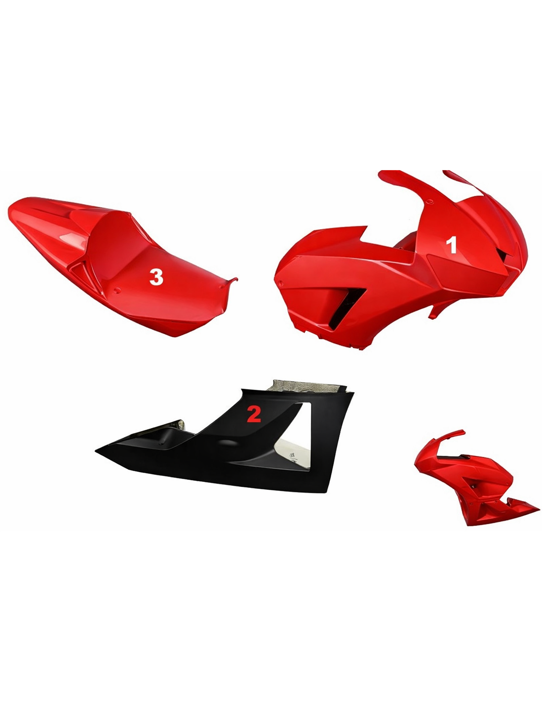 Il kit di carene comprende: cupolino, fianco destro e sinistro, vasca raccogli liquido chiusa ed omologata per la pista,codone (il copriserbatoio non è incluso nel prezzo).