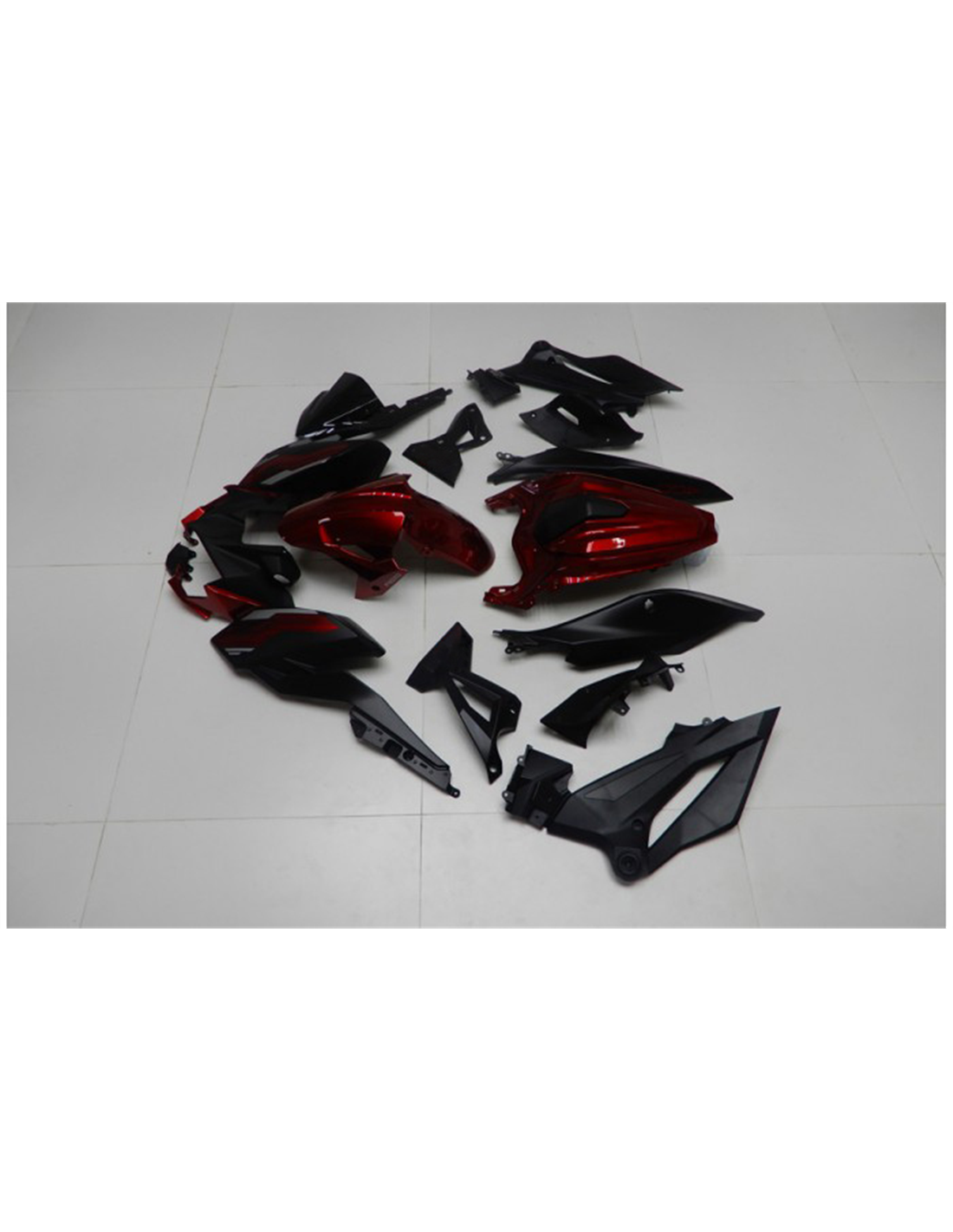 The fairing kit includes: front upper part, side fairings right and left, lower fairing right and left, back seat, front fender and all eventual internal black plastics.